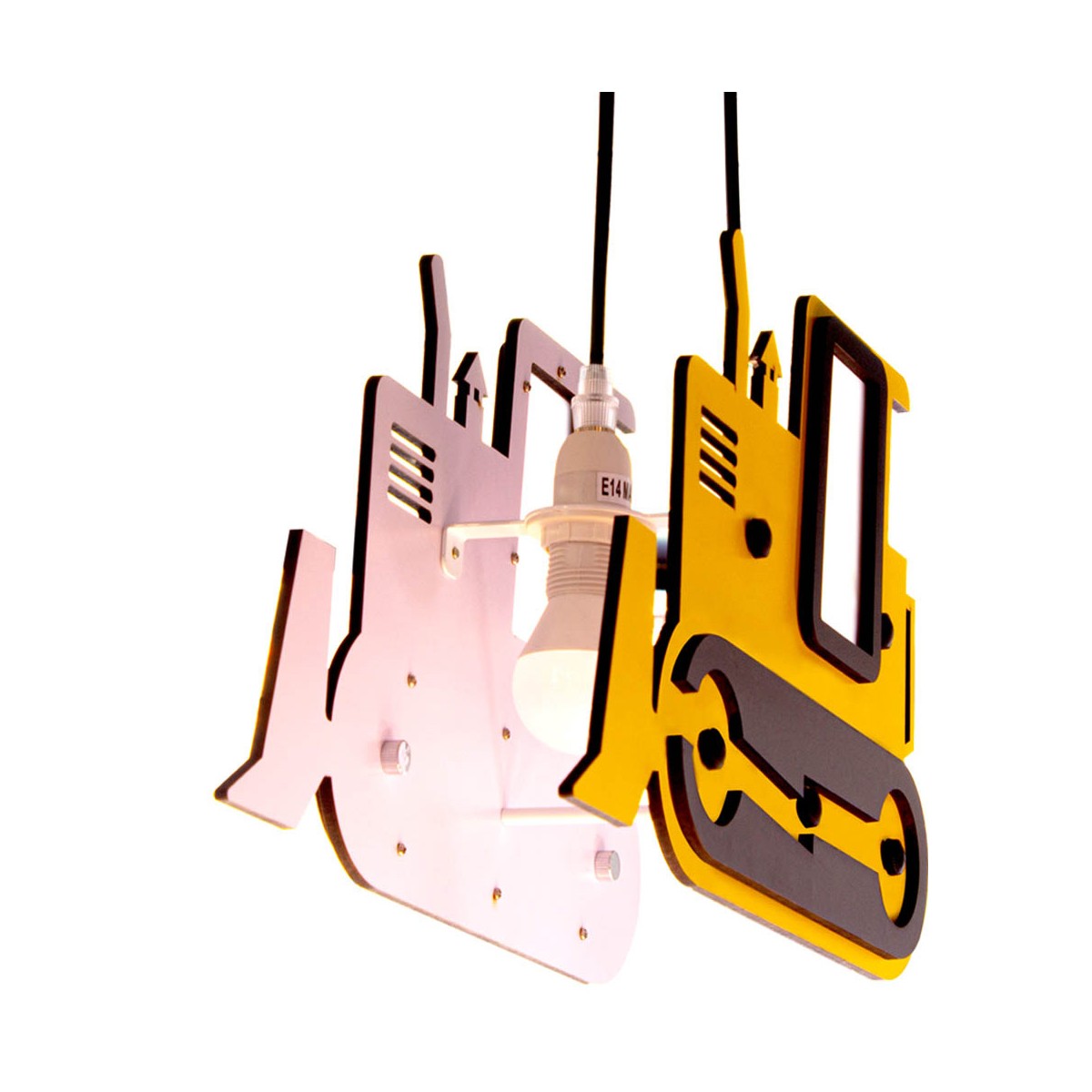 Suspension enfant en forme d'amusante pelleteuse en jaune. Parfait pour la décoration des chambres d'enfants. Les ampoules sont faciles à remplacer.