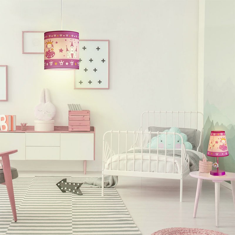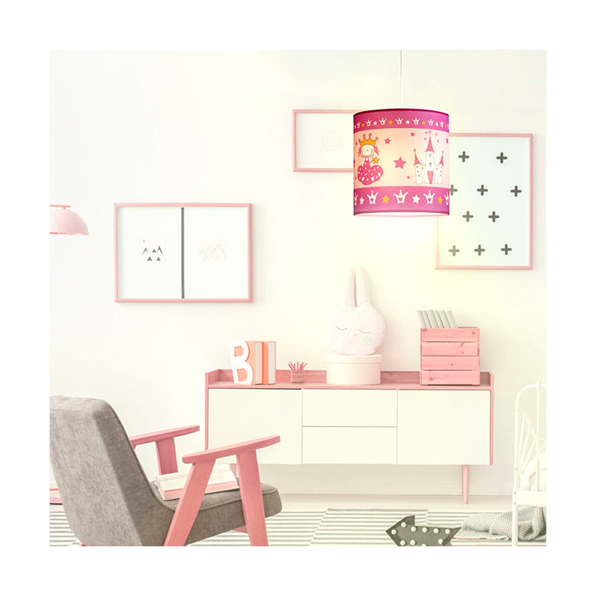 Suspension pour enfants en rose avec des dessins de princesses. Avec un abat-jour cylindrique en plastique parfait pour la décoration des chambres d'enfants. Remplacement facile de l'ampoule.