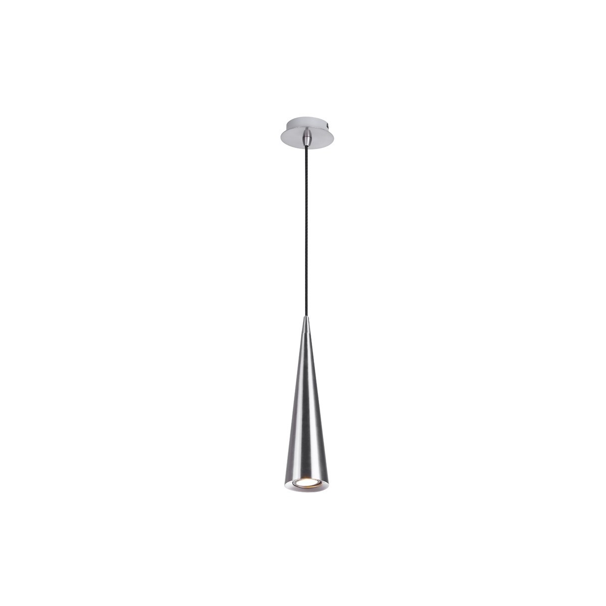 Suspension moderne en fer finition nickel satiné pour ampoule GU10, non incluse et câble noir. Le cône décoratif a un diamètre de 80 mm et atteint une hauteur maximale de 1,3 mètre.