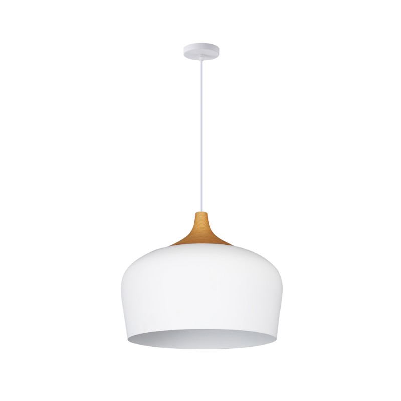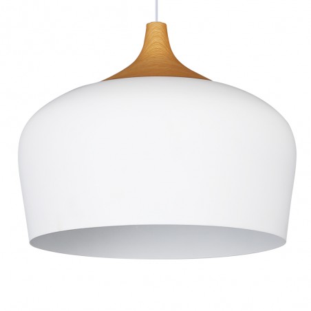 Lampe suspendue blanche pour le salon. Donnez une touche nordique à votre pièce avec cette lampe suspendue. Abat-jour en forme de dôme d'un diamètre de 30 centimètres, en métal blanc et décoré de bois dans la partie supérieure. Lampe de plafond idéale pour éclairer une zone spécifique de la pièce, comme le coin canapé.