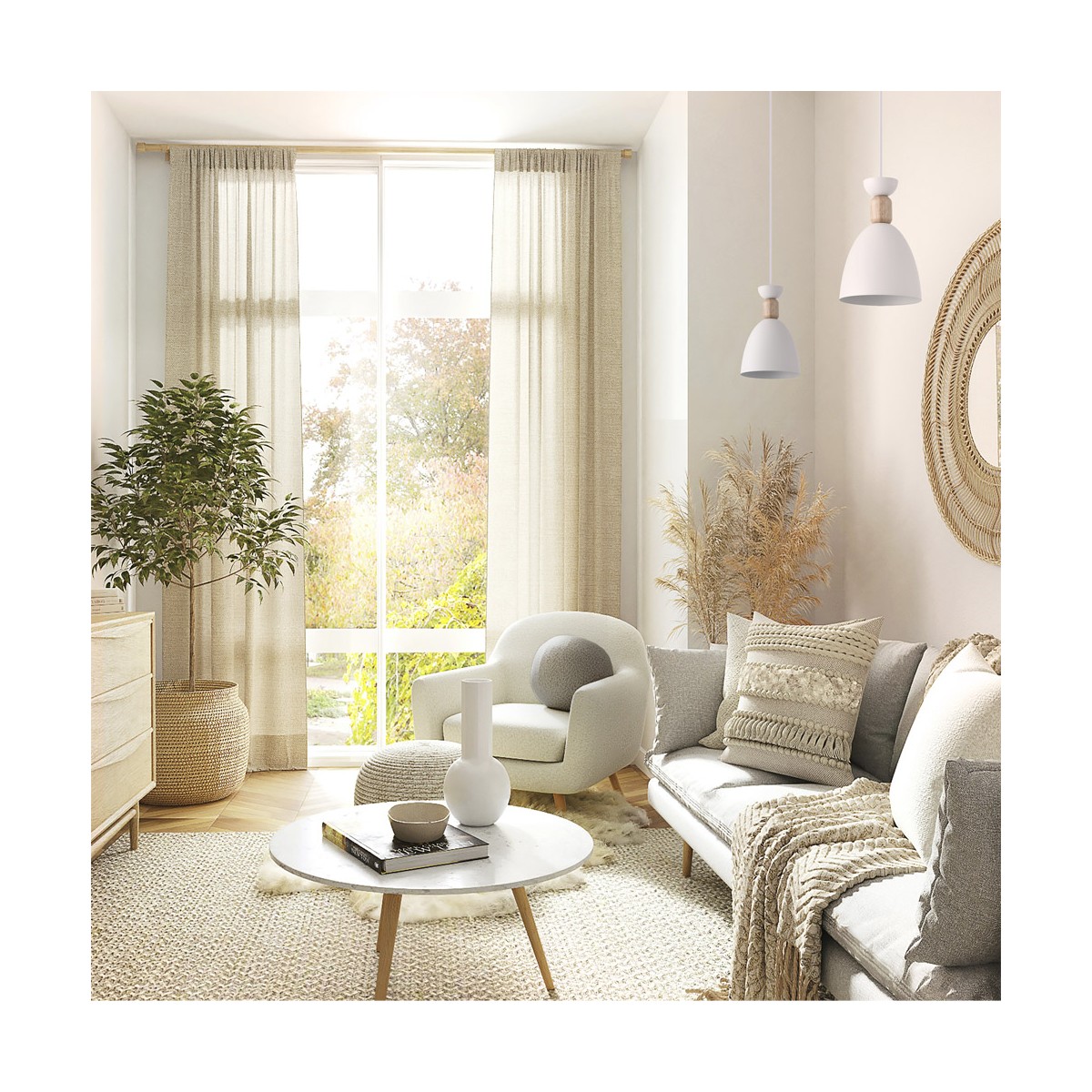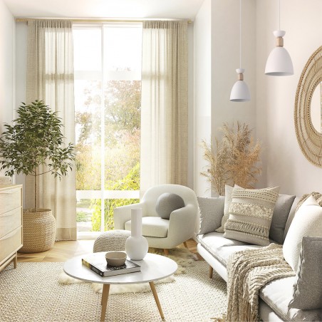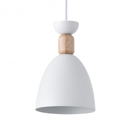 Lampe suspendue pour les salons et les cuisines. Lampe de plafond en blanc avec un morceau de bois en guise de décoration. Design de style nordique combinant le métal blanc et le bois. Lampe suspendue pour apporter de la lumière sur un point précis de la pièce. Vous pouvez installer plusieurs lampes suspendues en ligne sur un plan de travail ou une table.