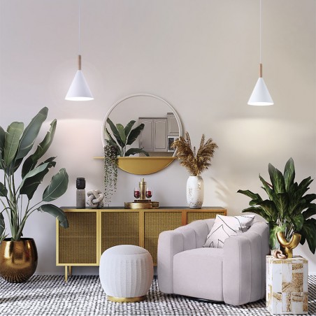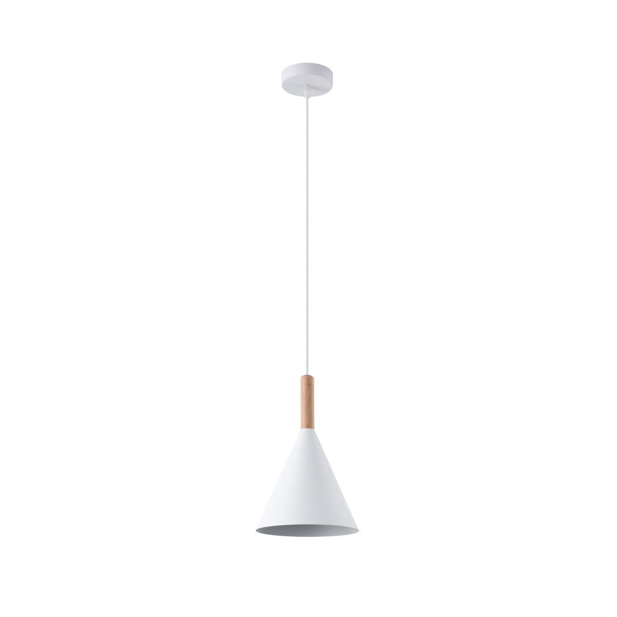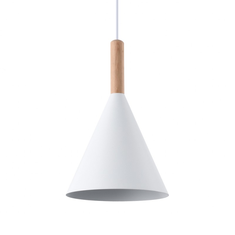 Lampe suspendue de style nordique. Lampe de plafond en blanc avec un morceau de bois décoratif sur l'abat-jour. Forme conique d'un diamètre de 18 centimètres, parfaite pour éclairer un point précis de la pièce. Vous pouvez installer une lampe suspendue de chaque côté du lit, au-dessus de la table de chevet.