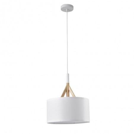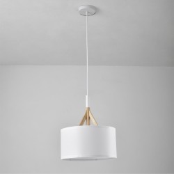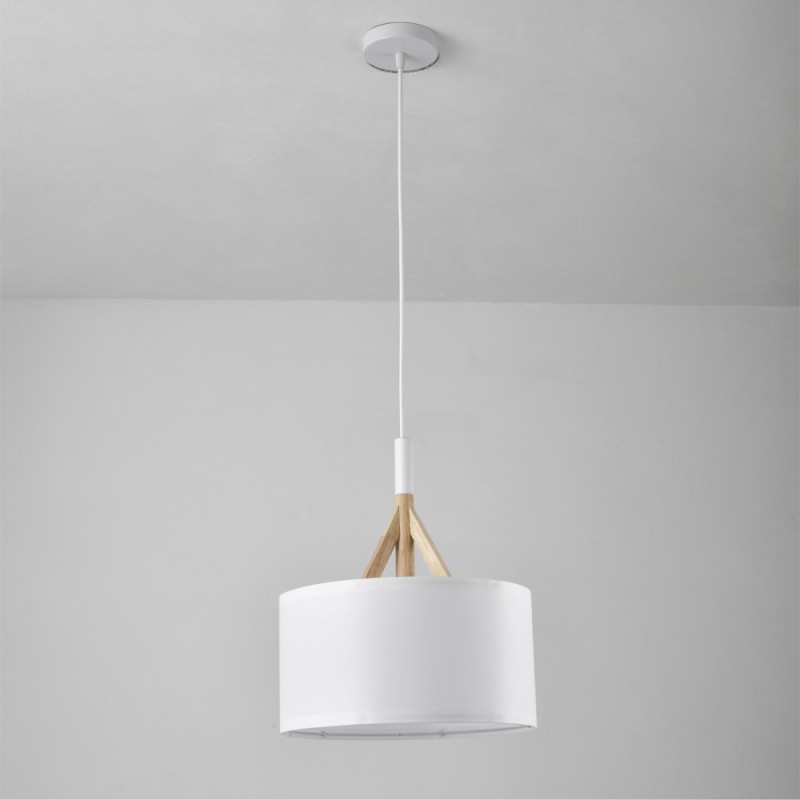 Lampe suspendue avec abat-jour en tissu blanc. Lampe de plafond de style nordique avec abat-jour en tissu blanc et décoration en bois sur le dessus. Parfait pour les pièces avec des meubles en bois et des tons blancs assortis. Donnez une touche scandinave à la décoration et à l'éclairage de votre maison. Diamètre de 30 centimètres.