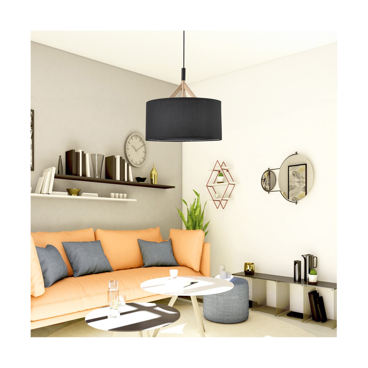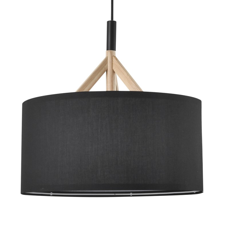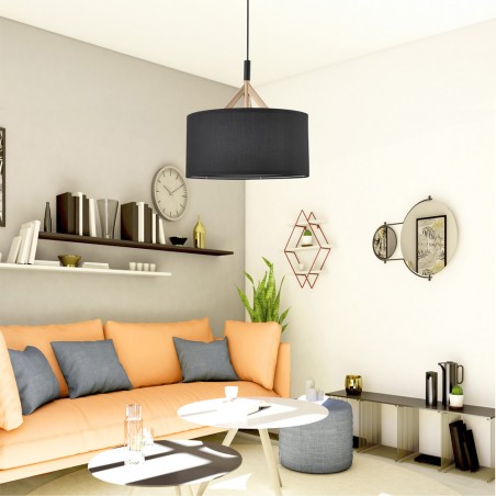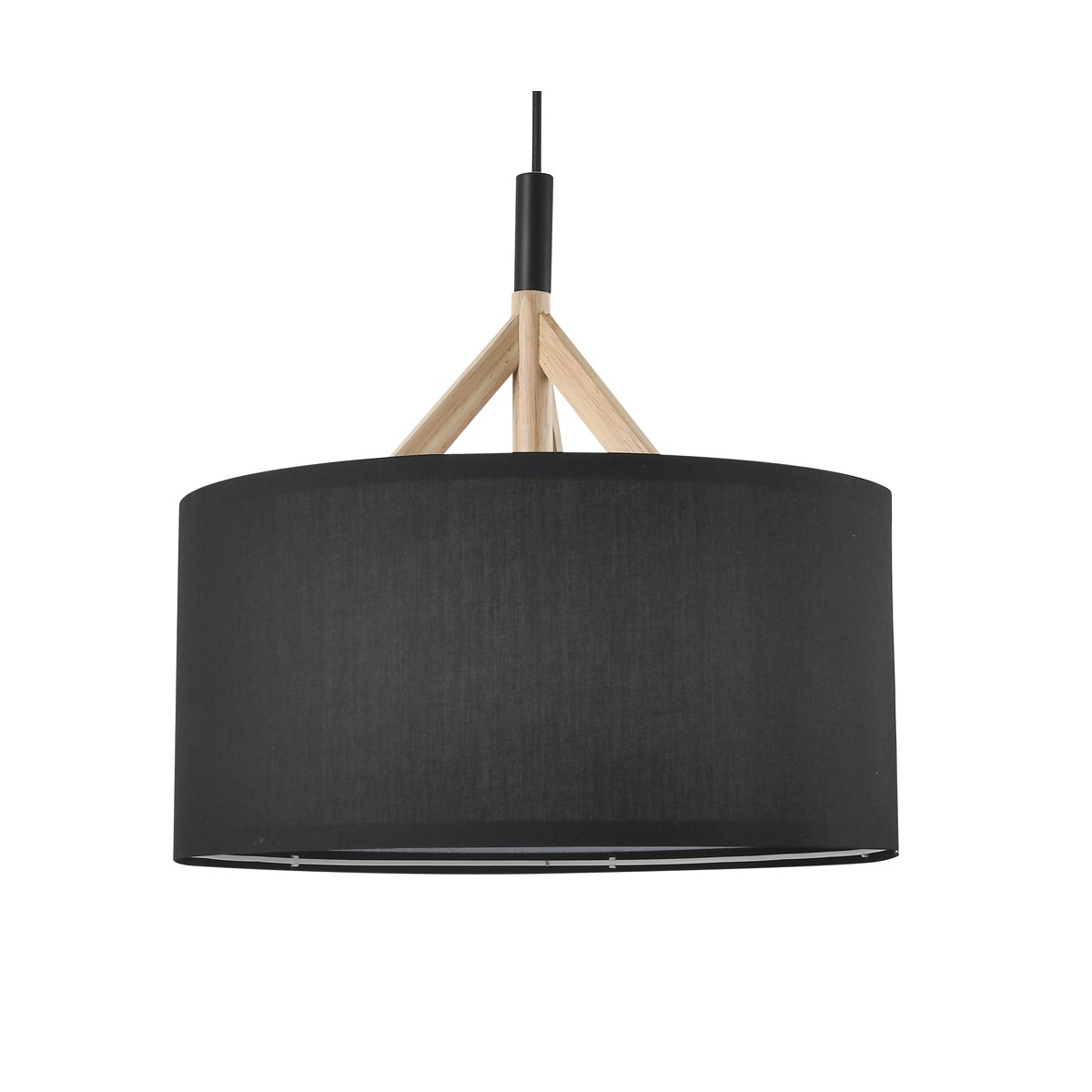 Lampe suspendue avec abat-jour en tissu noir. Lampe de plafond de style nordique avec abat-jour en tissu noir et décoration en bois sur le dessus. Parfait pour les pièces avec des meubles en bois et des tons sombres dans l'air du temps. Donnez une touche scandinave à la décoration et à l'éclairage de votre intérieur. Diamètre de 40 centimètres.