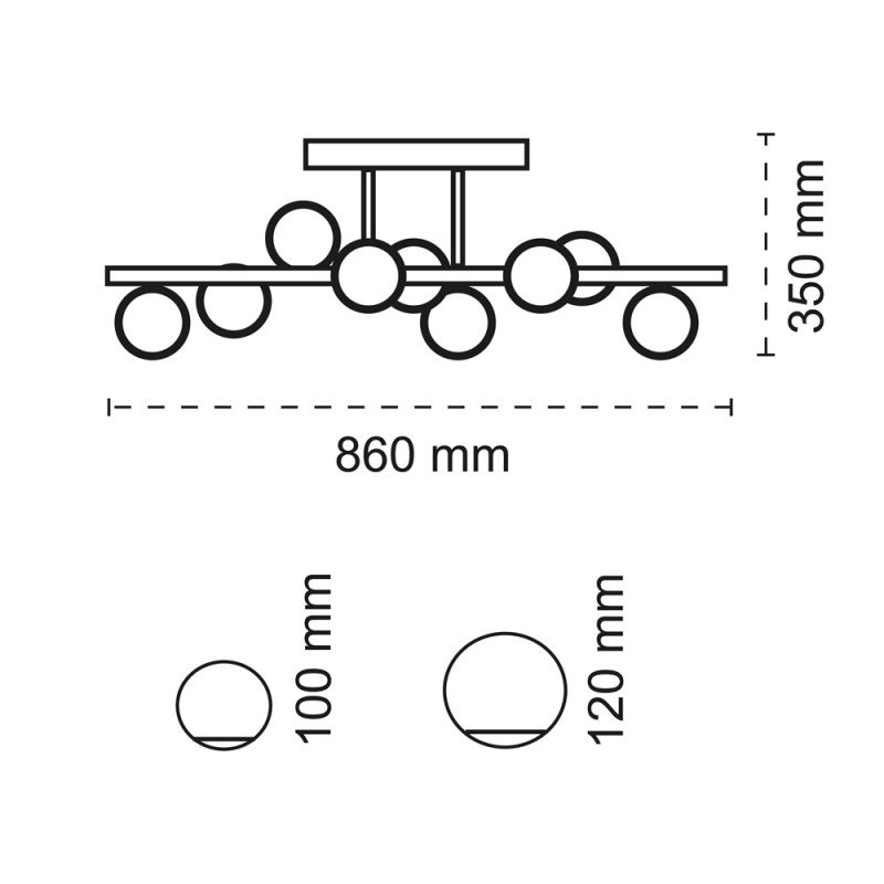 Plafonnier à neuf lumières Boston. Plafonnier pour l'éclairage décoratif d'une pièce telle que le salon ou la salle à manger. Design nordique combinant le métal noir et le verre fumé. Neuf abat-jour sphériques en verre pour des ampoules LED G9.