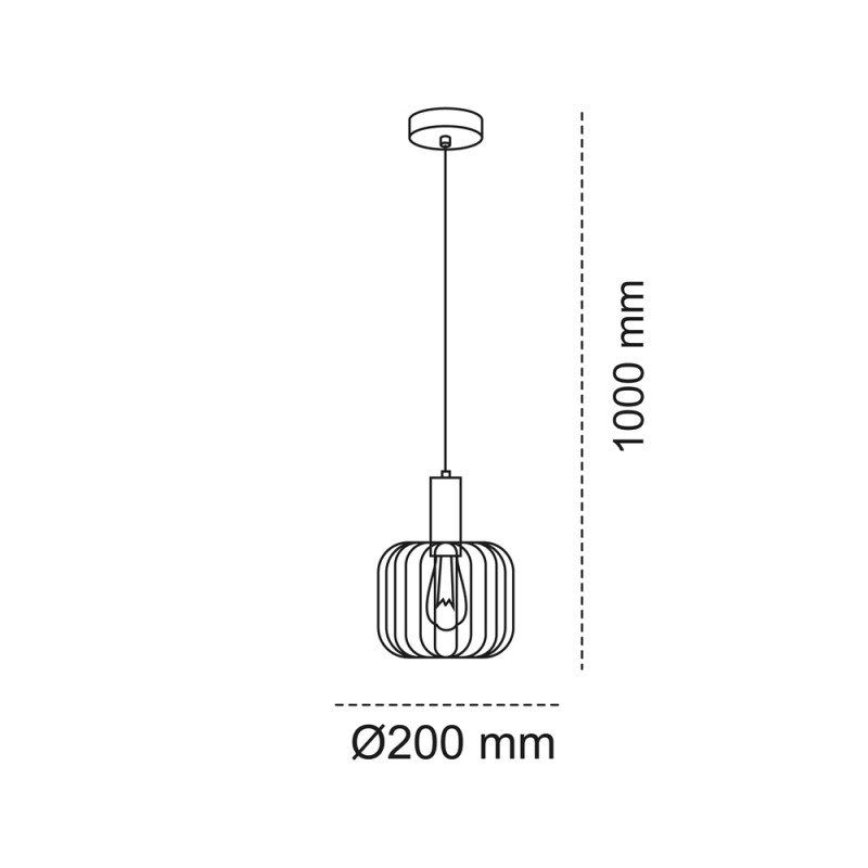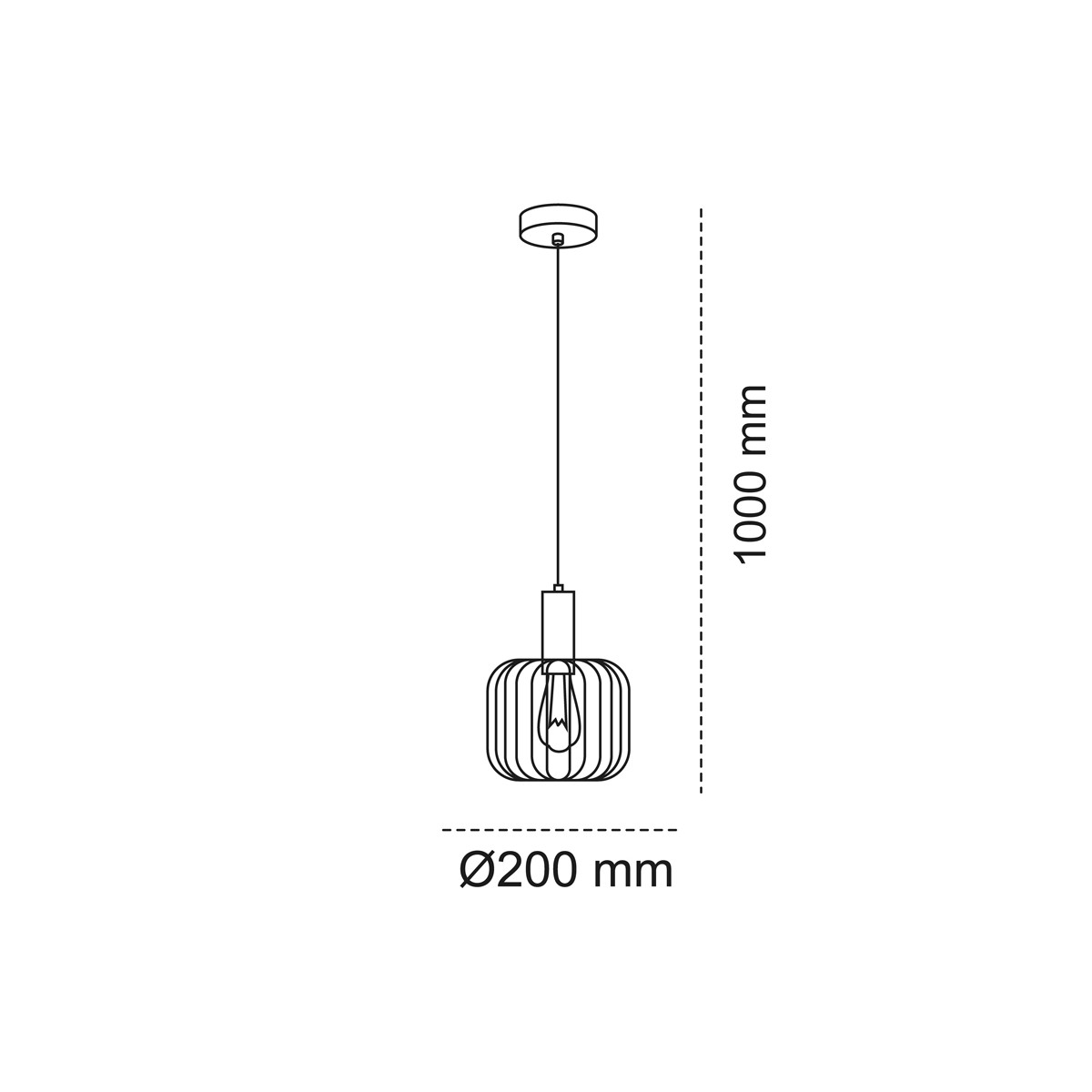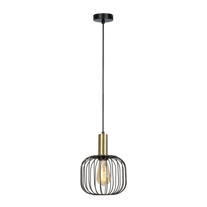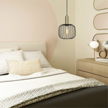 Lampe suspendue décorative de la collection Sofis. L'abat-jour est constitué de tiges métalliques noires, laissant l'ampoule visible. Le détail doré sur la partie supérieure de l'abat-jour complète le design offert par cette lampe. Lampe suspendue pour un éclairage décoratif dans les salons, les cuisines et les magasins.