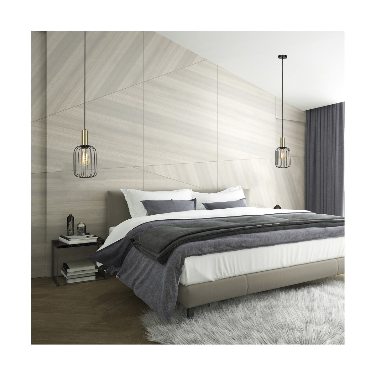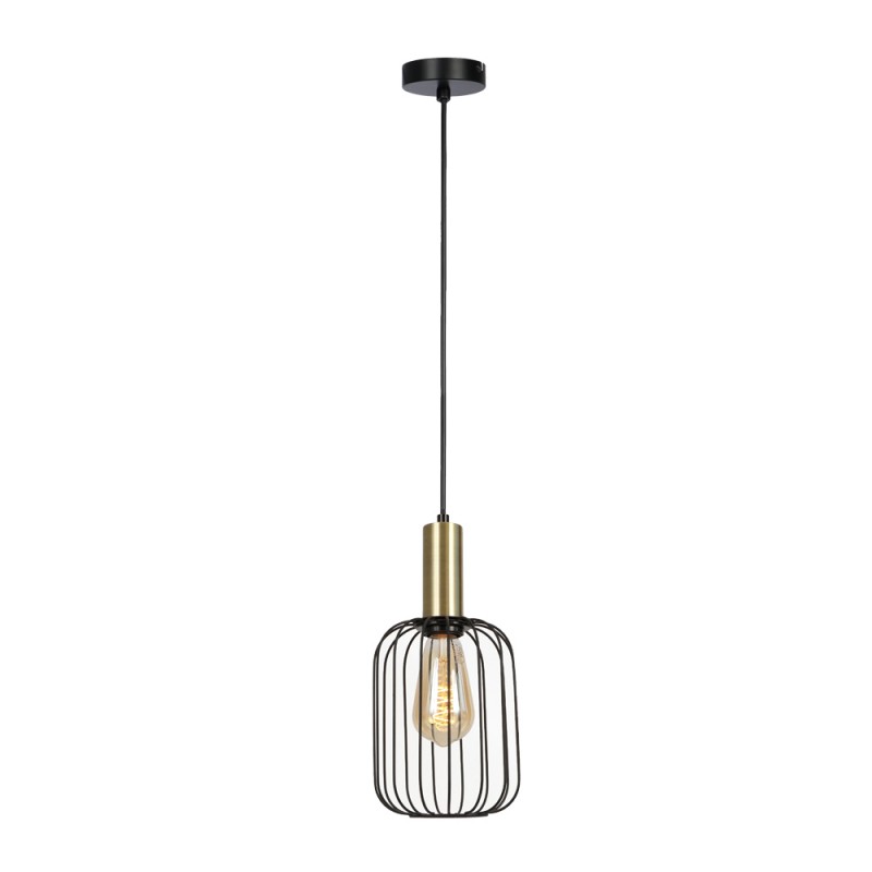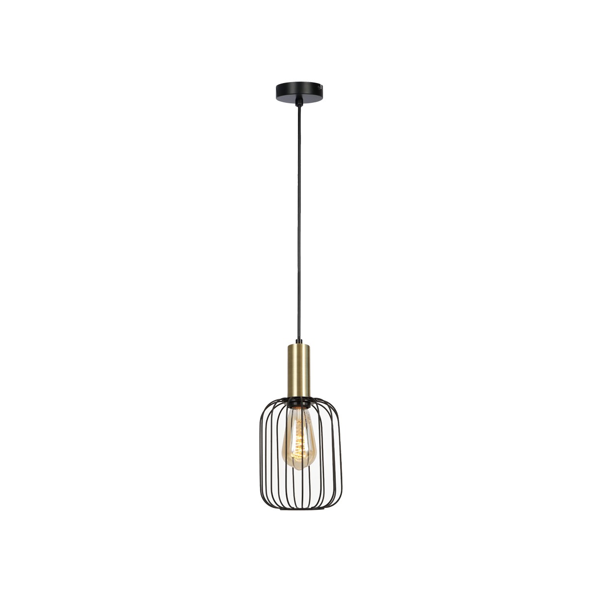 Lampe suspendue décorative de la collection Sofis. L'abat-jour est constitué de tiges métalliques noires, laissant l'ampoule visible. Le détail doré sur la partie supérieure de l'abat-jour complète le design offert par cette lampe. Lampe suspendue pour un éclairage décoratif dans les salons, les cuisines et les magasins.