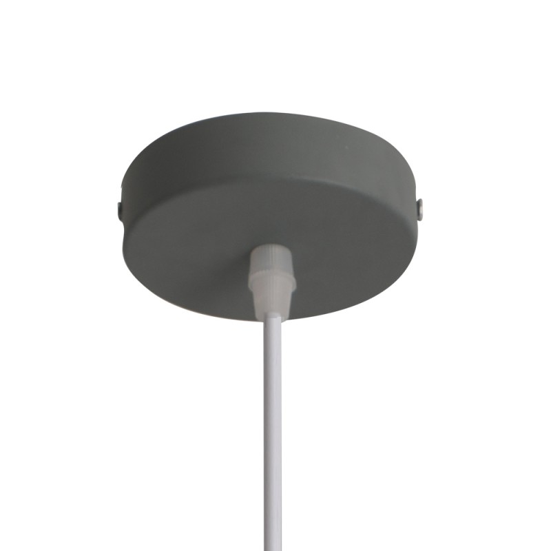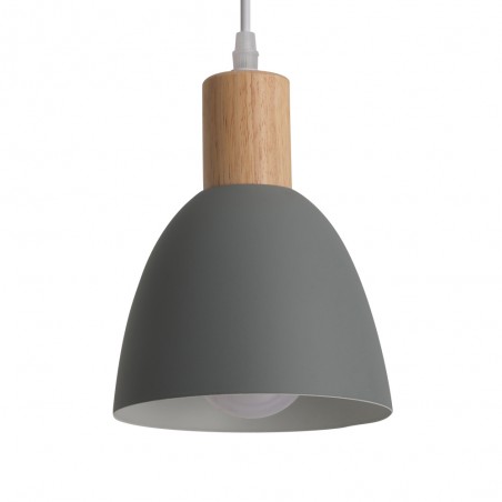 Suspension nordique de la collection Lilian. Lampe de plafond de couleur grise avec une pièce décorative en bois sur l'abat-jour. Son design compact de seulement 14 centimètres de diamètre en fait une solution idéale pour l'installer au-dessus de la table de chevet en guise d'éclairage.
