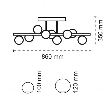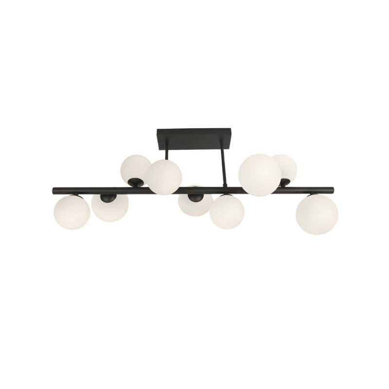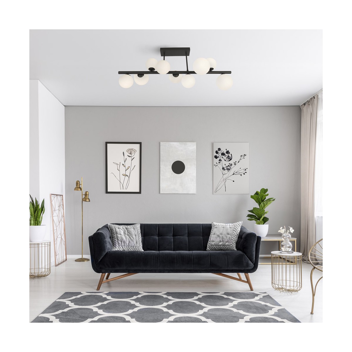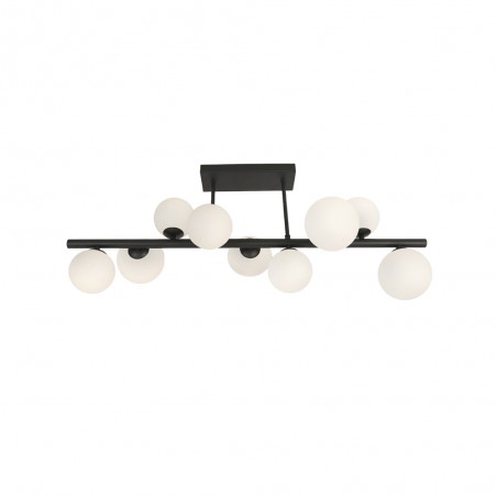 Plafonnier à neuf lumières Boston. Plafonnier pour l'éclairage décoratif d'une pièce telle que le salon ou la salle à manger. Design nordique combinant le métal noir et le verre opale blanc. Neuf abat-jour sphériques en verre pour des ampoules LED G9. Collection Boston.