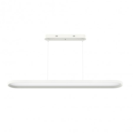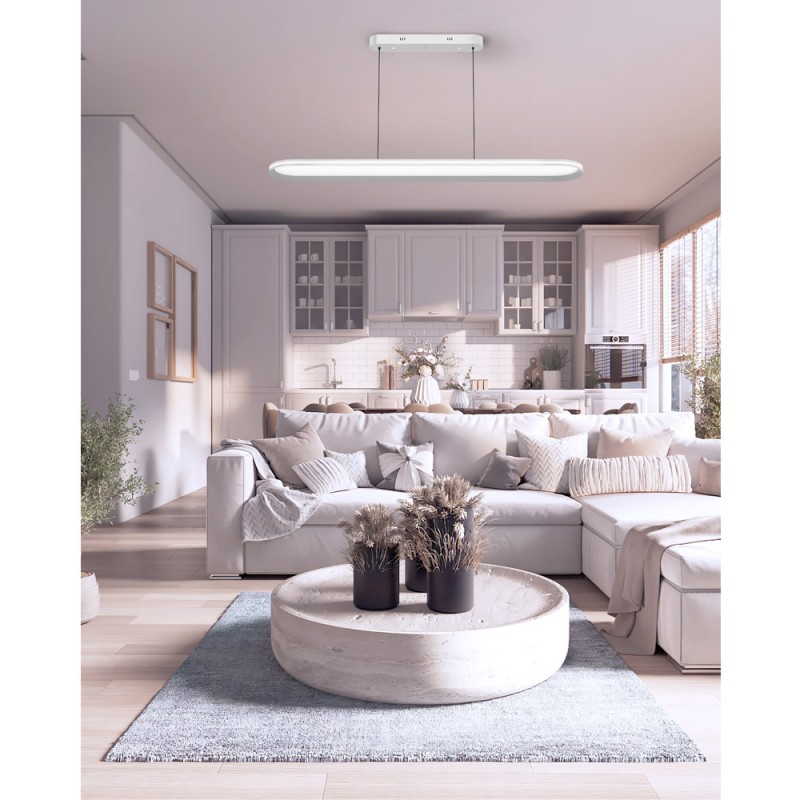 Lampe suspendue LED Morfeo pour les salons et les grandes cuisines. La télécommande permet de sélectionner la température de couleur entre chaud, blanc neutre ou froid (3000-4000-5500K). Plafonnier à LED pour l'éclairage fonctionnel d'un plan de travail de cuisine ou d'une table à manger. Structure en métal blanc et diffuseur en polycarbonate. Télécommande.