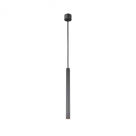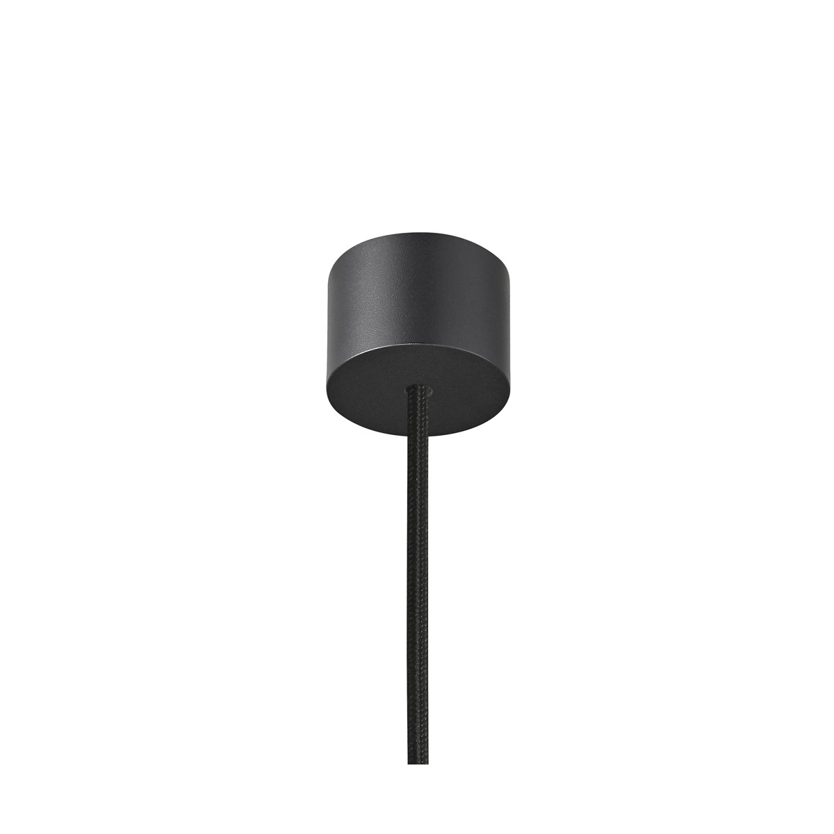Suspension tubulaire mince anodisée. Lampe de plafond avec un point lumineux focalisé, idéale pour éclairer les plans de travail de la cuisine, les comptoirs de bar ou les tables de salle à manger. Fabriquée en aluminium anodisé. Câble en textile noir.