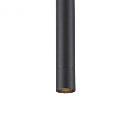 Suspension tubulaire étroite de couleur noire. Lampe de plafond avec un point lumineux focalisé, idéale pour éclairer les plans de travail de la cuisine, les comptoirs de bar ou les tables de salle à manger. Fabriquée en aluminium avec finition noire. Câble textile noir.