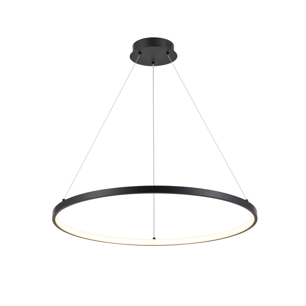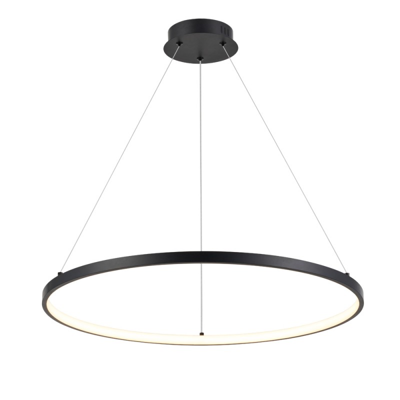 Suspension décorative composée d'un anneau métallique de 60 cm de diamètre avec LED intégrée de 52W à haute luminosité (5200 lm) et lumière chaude. L'anneau est suspendu par trois cordes réglables en hauteur.