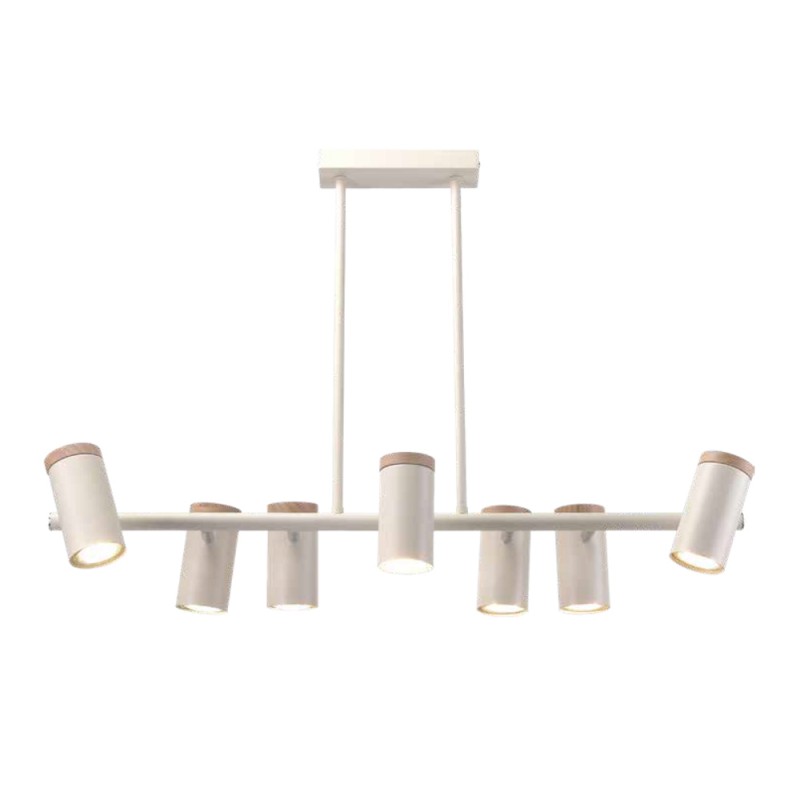 Suspension métallique à sept spots GU10 avec détails en bois. La hauteur de la lampe n'est pas réglable, mais les spots peuvent être orientés pour diriger la lumière vers le point souhaité.