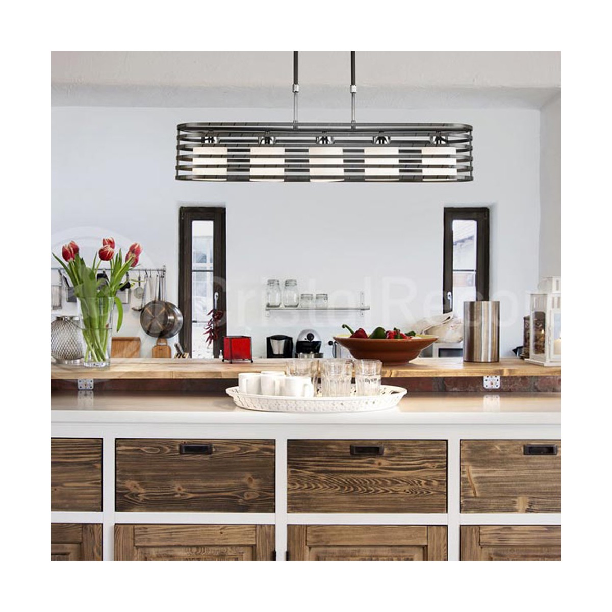 Lampe moderne avec un écran couleur marron et des tulipes en cristal à l'intérieur. Fonctionne avec 5 ampoules E27 Max. 40W (non inclus). Parfait pour les salons, les salles à manger ou les cuisines modernes.