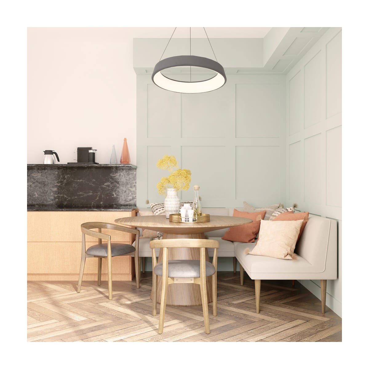 Suspension de plafond avec une lumière LED chaude de 3000K. La hauteur de la lampe peut être facilement réglée à l'aide d'un système simple dissimulé dans la rosace. La rosette et l'anneau de la lampe sont tous deux en aluminium avec un diffuseur en acrylique qui laisse passer la lumière tout en réduisant l'indice d'éblouissement. Vous pouvez trouver la lampe en trois finitions différentes : blanc, brun et argent.