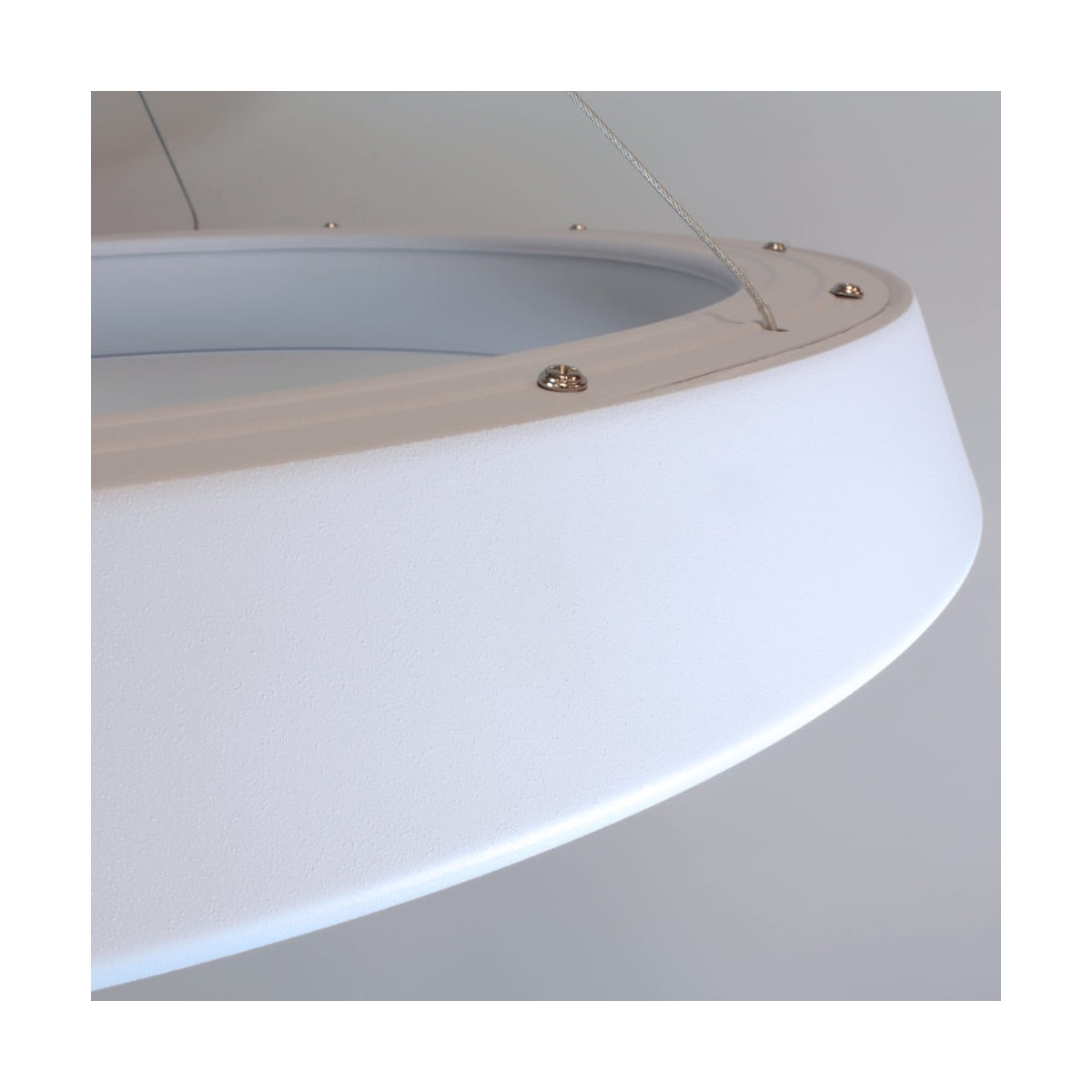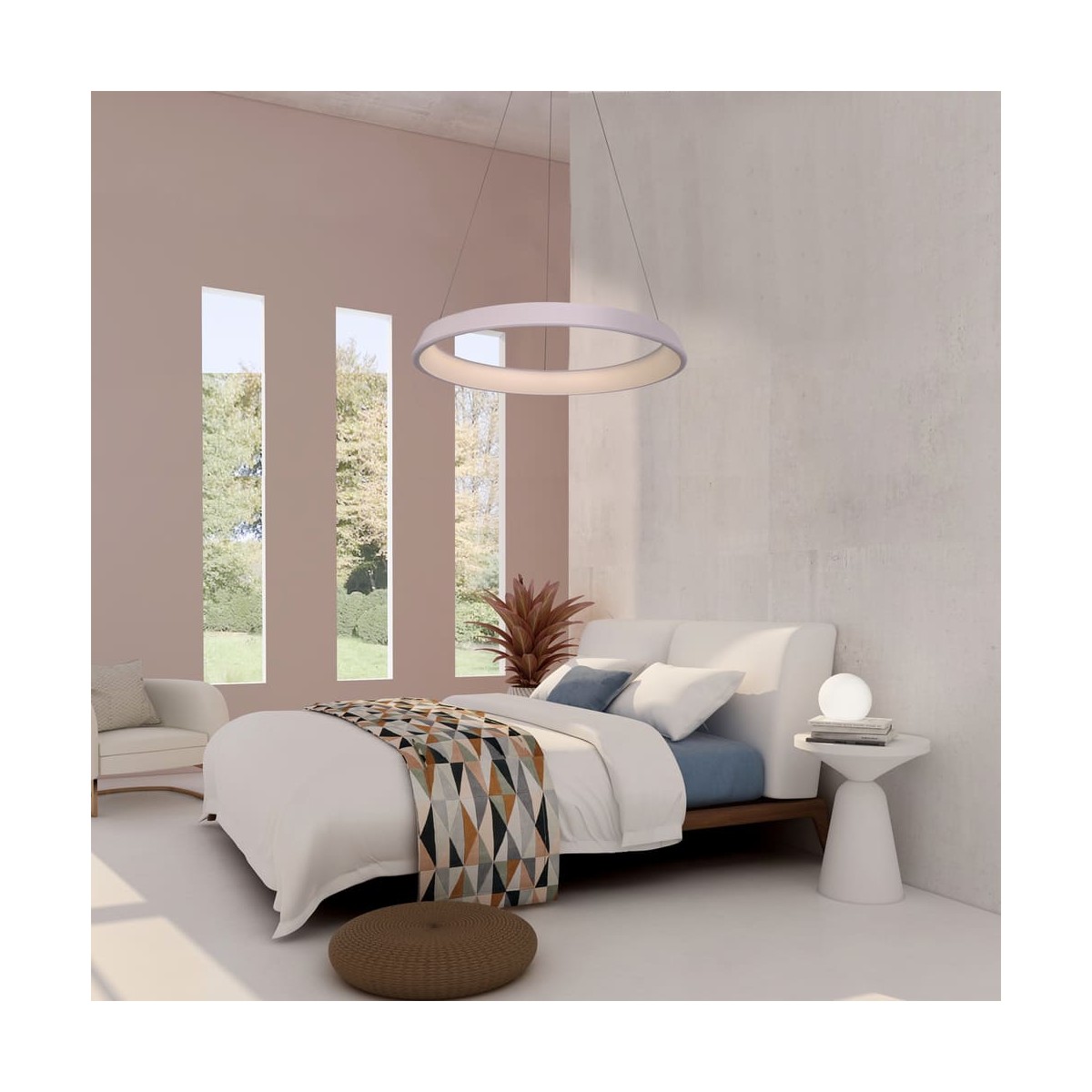 Suspension de plafond avec une lumière LED chaude de 3000K. La hauteur de la lampe peut être facilement réglée à l'aide d'un système simple dissimulé dans la rosace. La rosette et l'anneau de la lampe sont tous deux en aluminium avec un diffuseur en acrylique qui laisse passer la lumière tout en réduisant l'indice d'éblouissement. Vous pouvez trouver la lampe en trois finitions différentes : blanc, brun et argent.