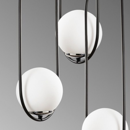 Lampe décorative avec un design géométrique de trois pendentifs et une rosace ronde au plafond. Les lampes sont composées d'un anneau de 60 cm en métal laqué noir et d'un abat-jour en verre blanc mat. La hauteur de la lampe peut être réglée en ajustant la longueur du câble qui ne laisse que l'anneau métallique, soit une longueur maximale de 146 cm. Convient aux ampoules E27.