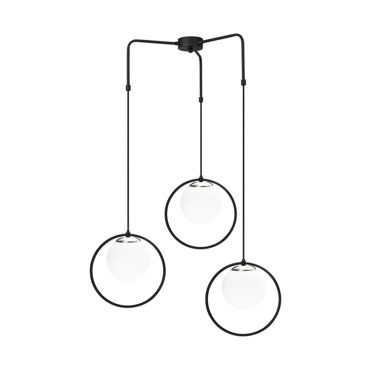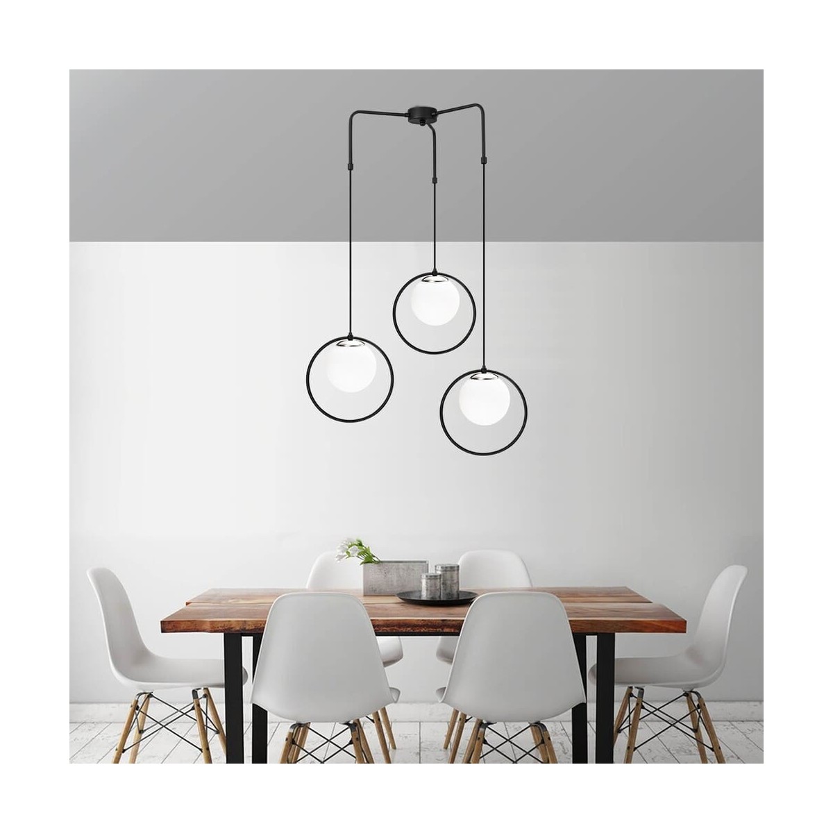 Suspension décorative ronde avec trois lampes à suspension avec longueur de câble réglable. Les lumières sont formées par un abat-jour en verre blanc mat entouré d'un anneau métallique noir. Il permet de créer différentes compositions d'éclairage décoratif, en s'adaptant aux différents espaces, en réglant la hauteur des trois points lumineux. Parfait pour les salles à manger, les salons et les chambres à coucher à la recherche d'un style d'éclairage différent. Pour ampoules E27, non incluses.