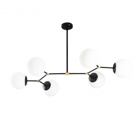 Suspension à six lumières, avec un corps en métal laqué noir et des abat-jour en verre blanc mat. Cette lampe a un style simple et moderne, ce qui la rend parfaite pour les grands espaces modernes qui ont besoin d'apporter une lumière supplémentaire dans la pièce.