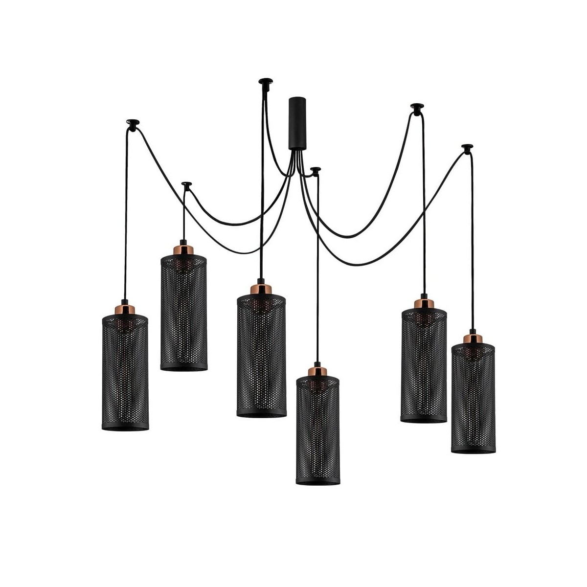 Plafonnier décoratif avec six suspensions réglables en hauteur et dont le point lumineux peut être déplacé au plafond à l'aide d'un serre-câble, grâce à son câble extra-long de 180 cm. L'abat-jour en métal de chacune des lampes de style industriel. Pour ampoules LED E27 non incluses.
