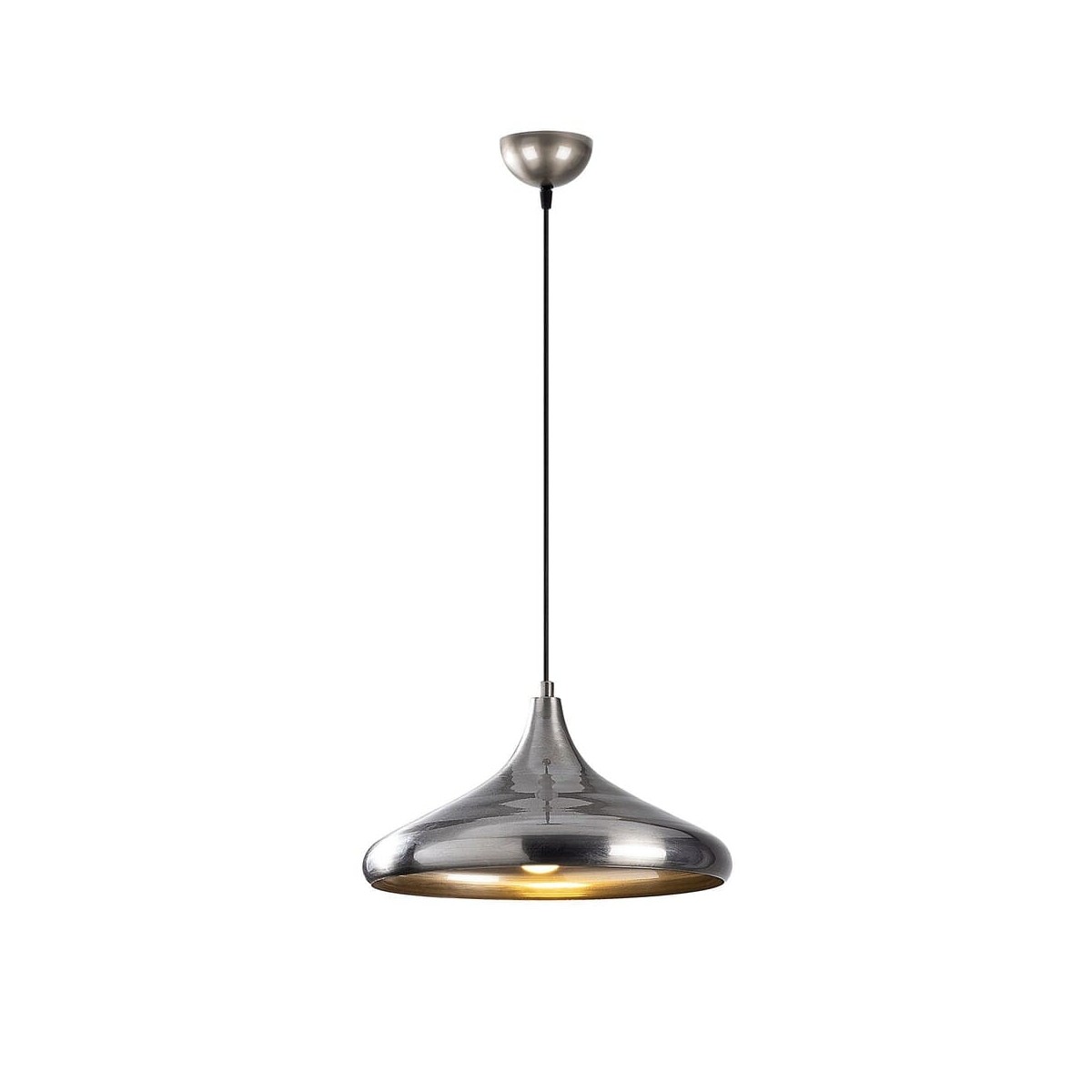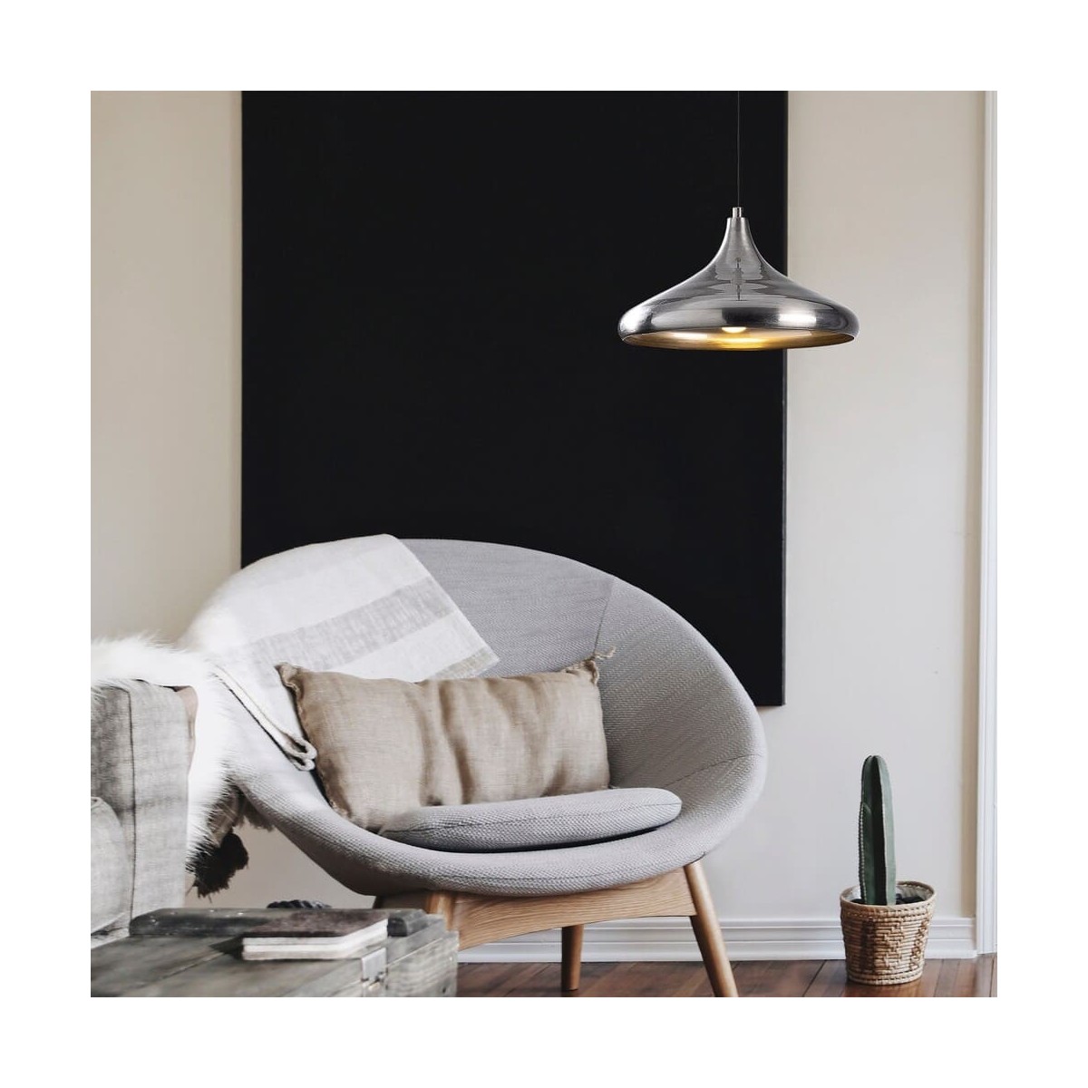 Suspension décorative au plafond avec un câble réglable jusqu'à 90 cm. Abat-jour métallique en finition chromée brillante avec intérieur doré. Il permet de créer différentes compositions d'éclairage décoratif, en s'adaptant aux différents espaces, en réglant la hauteur de la lampe. Pour ampoules E27, non incluses.