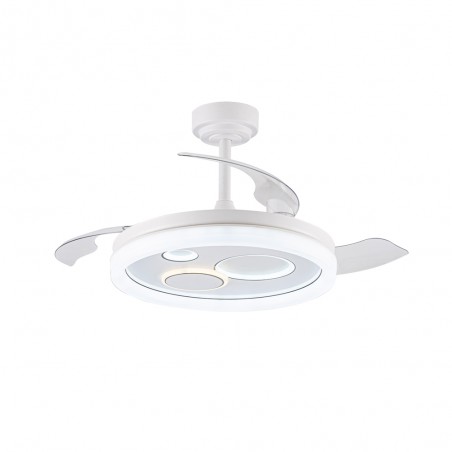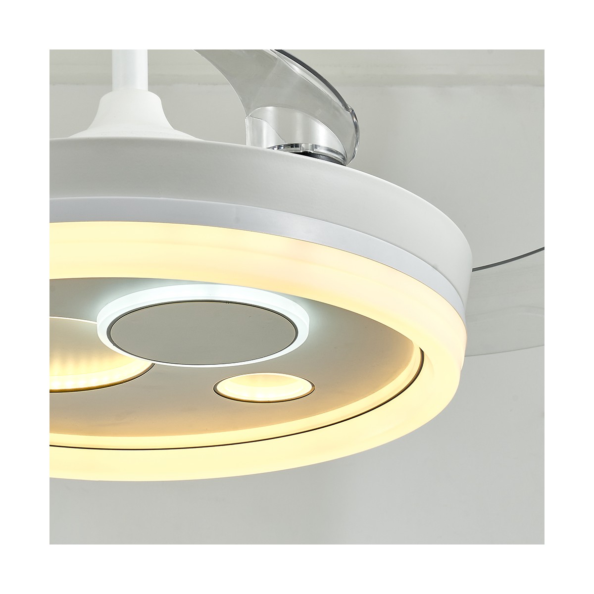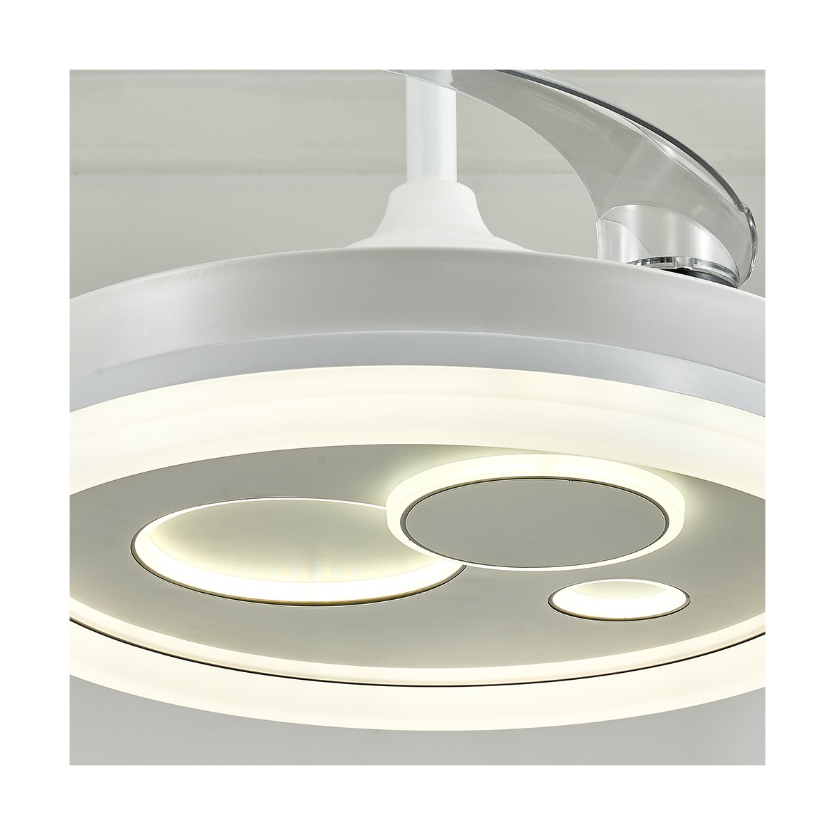 Ventilateur de plafond LED avec pales rétractables Naira. Ventilateur de plafond avec moteur à courant continu silencieux avec 6 vitesses de rotation, fonction inverse et minuterie. Le diffuseur offre un design original de style moderne basé sur des formes circulaires de différents diamètres. Il dispose de différentes températures de couleur pour créer des ambiances lumineuses dans la maison. Télécommande incluse.
