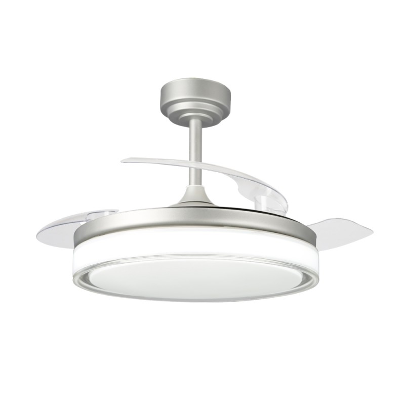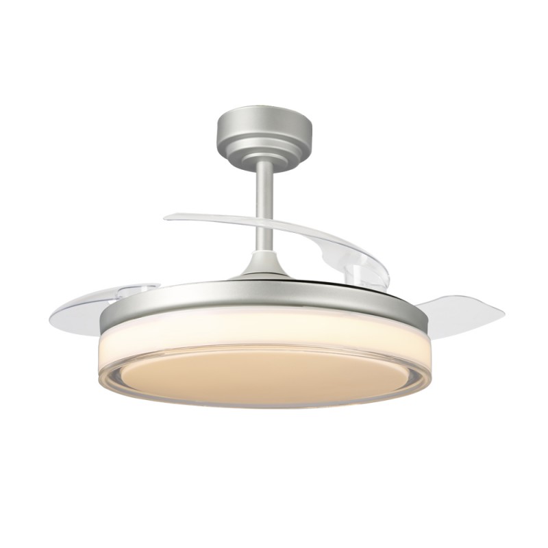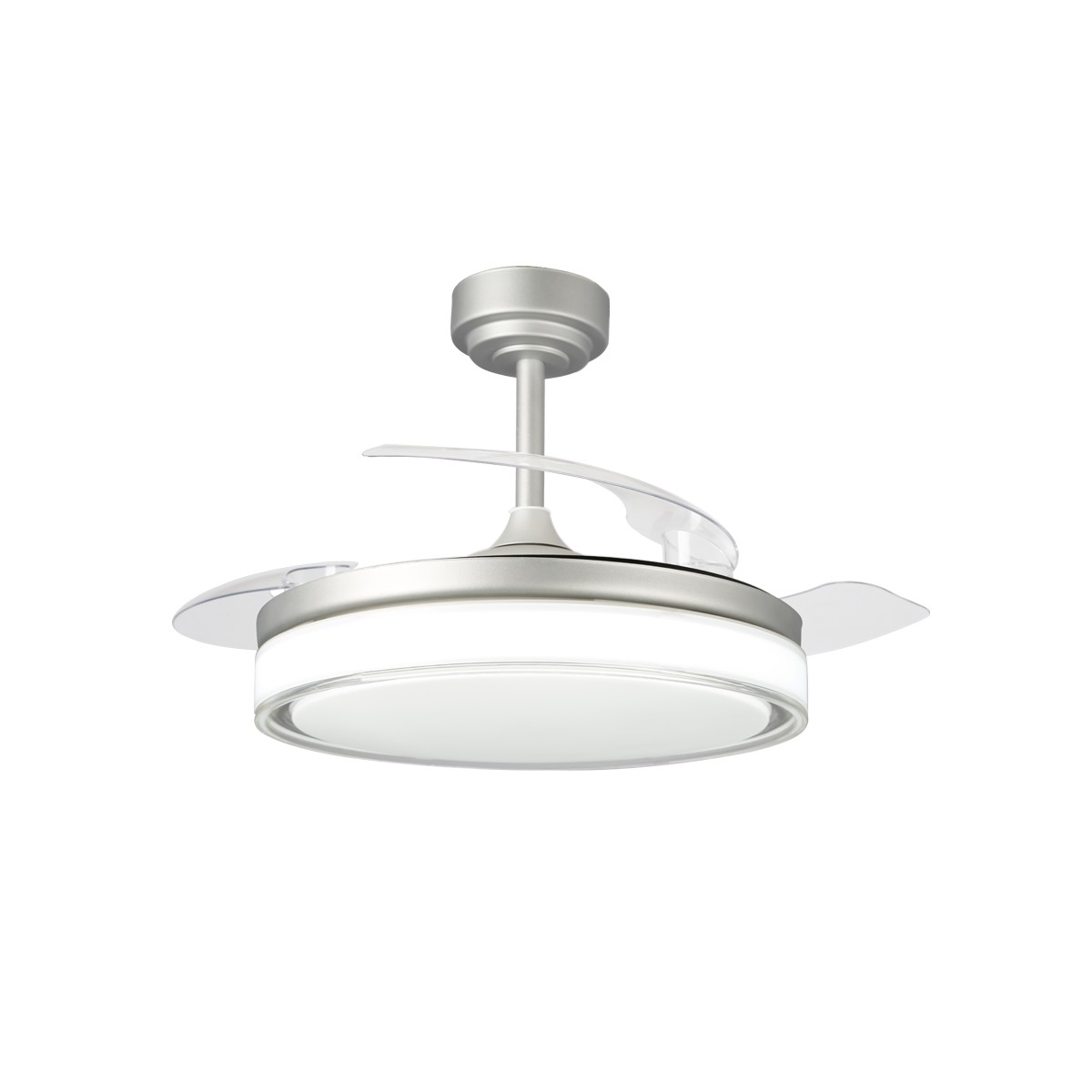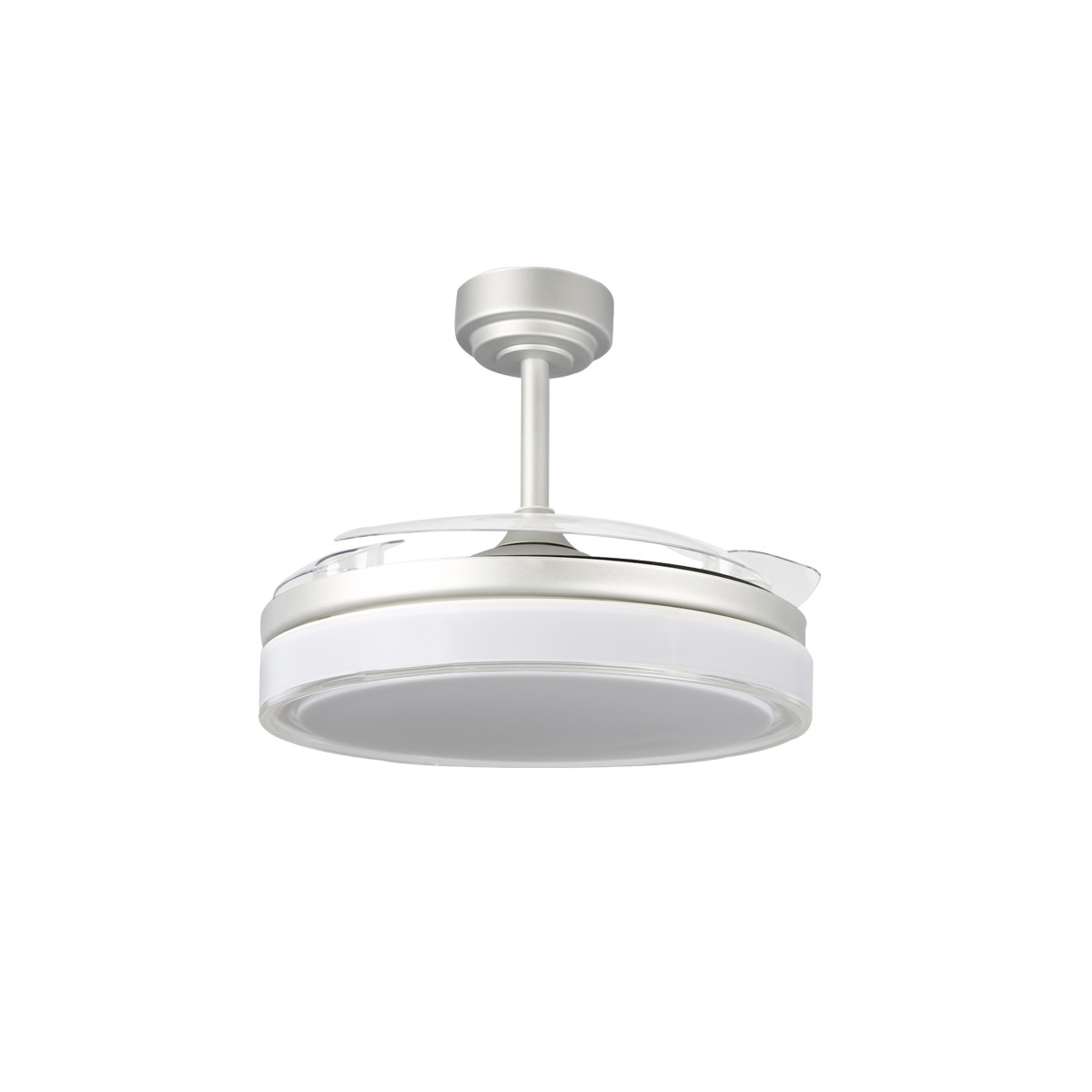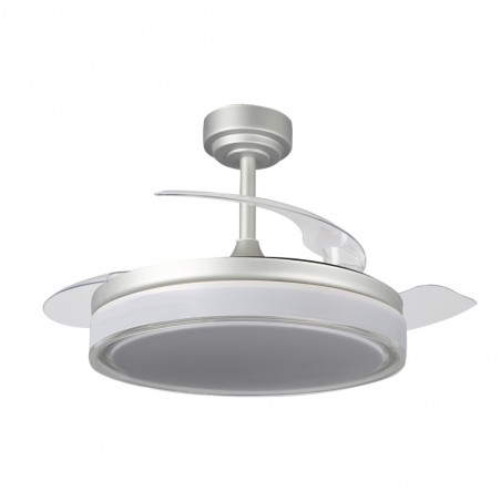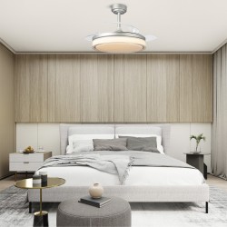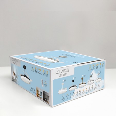 Ventilateur de plafond Aneto avec pales rétractables. Apportez un flux d'air important dans votre chambre ou votre salon grâce à ce ventilateur ultra-silencieux doté de six vitesses de rotation. Le ventilateur intègre un éclairage LED de 72W qui permet de résoudre l'éclairage principal de la pièce. Les pales du ventilateur sont rétractables, ce qui permet d'utiliser le ventilateur comme plafonnier lorsqu'il n'est pas utilisé. La télécommande incluse permet de contrôler l'éclairage, la vitesse de rotation et les fonctions du ventilateur. Trois températures de couleur, mémoire de mise en marche, fonction de rotation inverse et minuterie. Ventilateur de plafond gris avec pales transparentes.