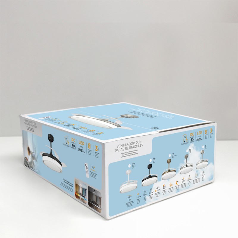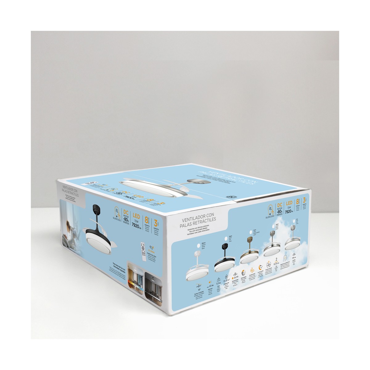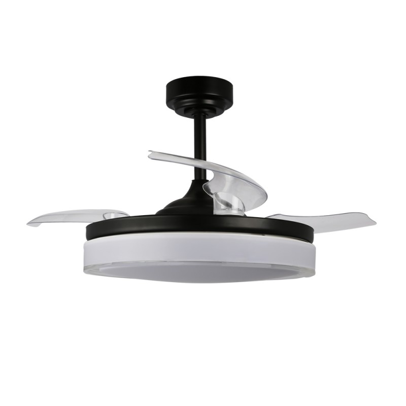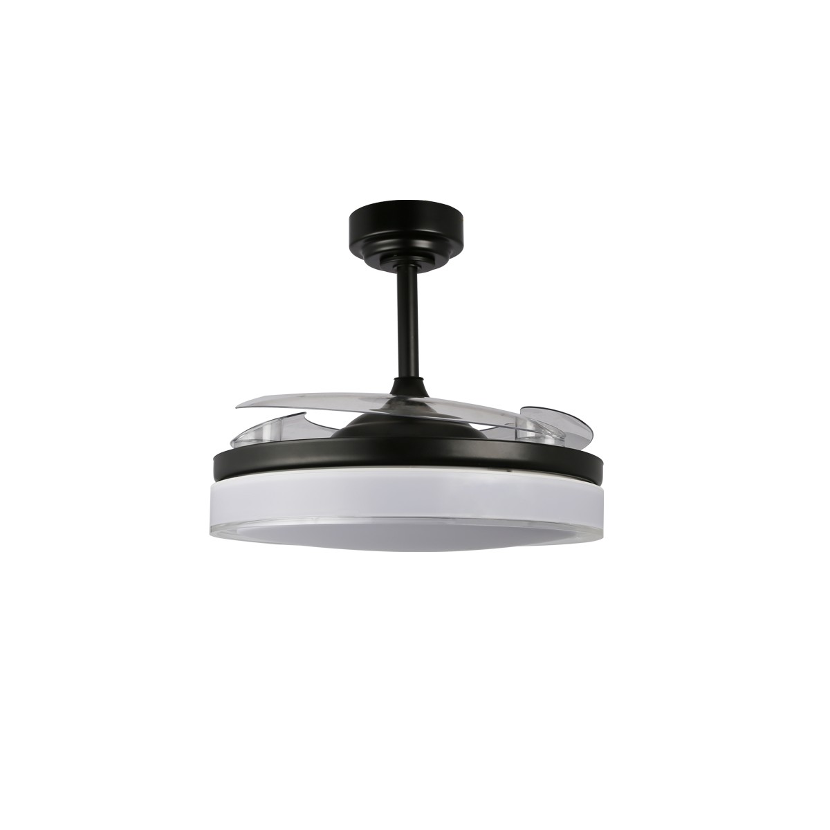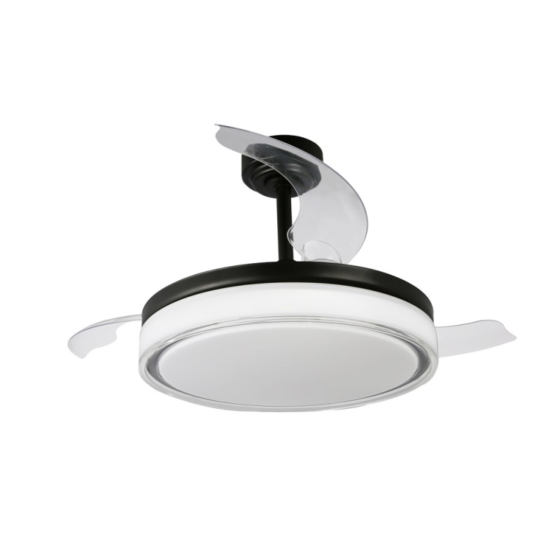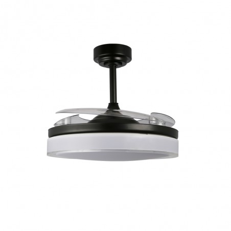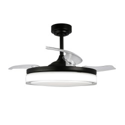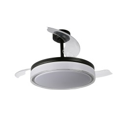 Ventilateur de plafond Aneto avec pales rétractables. Apportez un flux d'air important dans votre chambre ou votre salon grâce à ce ventilateur ultra-silencieux doté de six vitesses de rotation. Le ventilateur intègre un éclairage LED de 72W qui permet de résoudre l'éclairage principal de la pièce. Les pales du ventilateur sont rétractables, ce qui permet d'utiliser le ventilateur comme plafonnier lorsqu'il n'est pas utilisé. La télécommande incluse permet de contrôler l'éclairage, la vitesse de rotation et les fonctions du ventilateur. Trois températures de couleur, mémoire de mise en marche, fonction de rotation inverse et minuterie. Ventilateur de plafond noir avec pales transparentes.