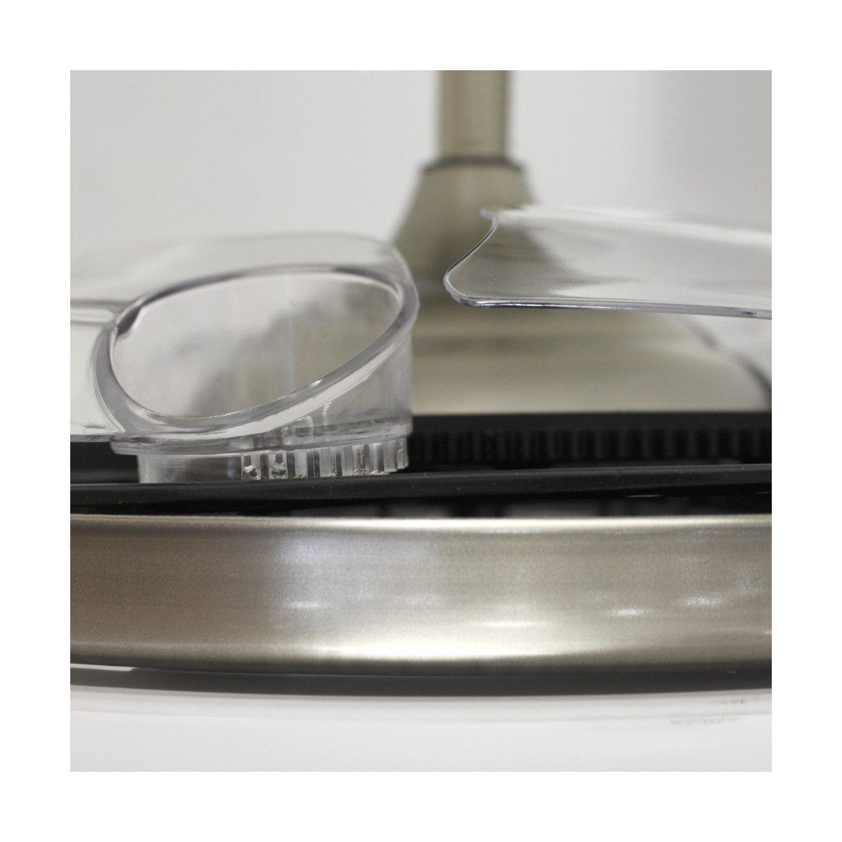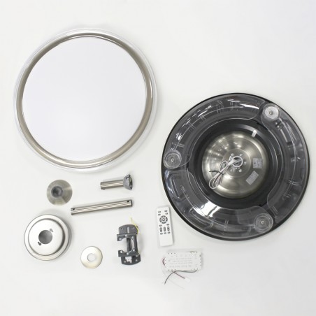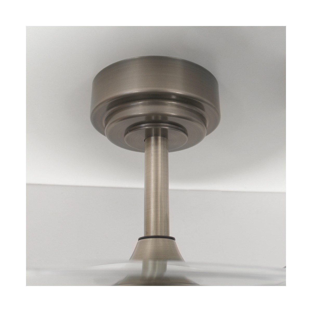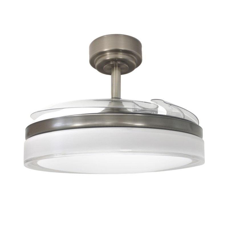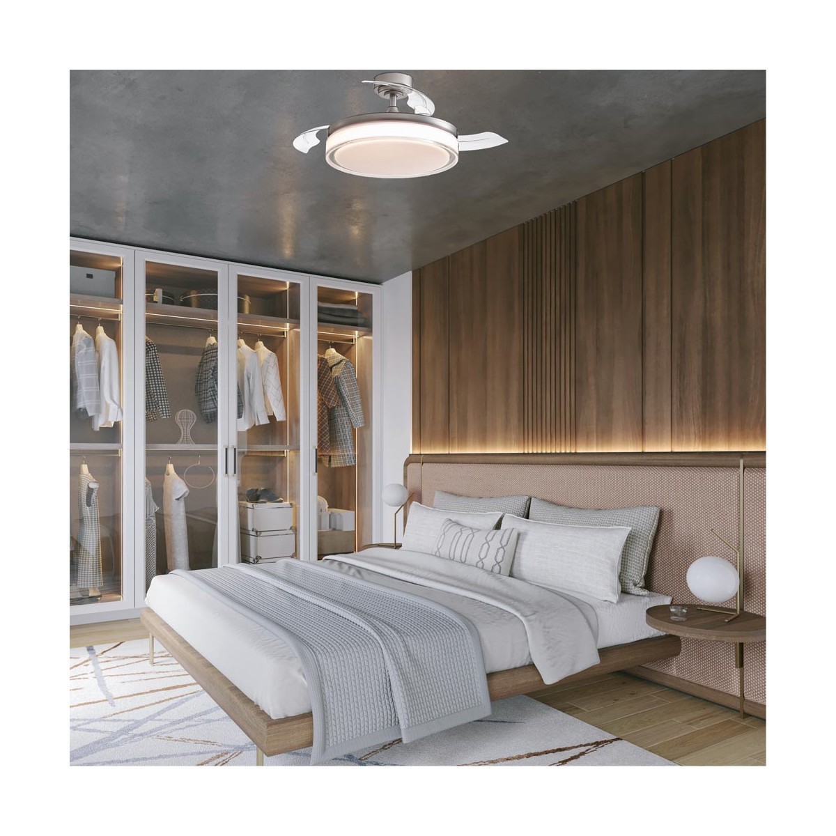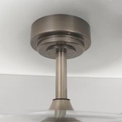 Ventilateur de plafond Aneto avec pales rétractables. Apportez un flux d'air important dans votre chambre ou votre salon grâce à ce ventilateur ultra-silencieux doté de six vitesses de rotation. Le ventilateur intègre un éclairage LED de 72W qui permet de résoudre l'éclairage principal de la pièce. Les pales du ventilateur sont rétractables, ce qui permet d'utiliser le ventilateur comme plafonnier lorsqu'il n'est pas utilisé. La télécommande incluse permet de contrôler l'éclairage, la vitesse de rotation et les fonctions du ventilateur. Trois températures de couleur, mémoire de mise en marche, fonction de rotation inverse et minuterie. Ventilateur de plafond niquel avec pales transparentes.