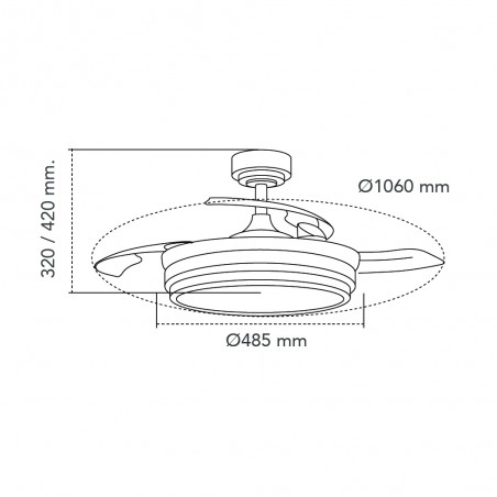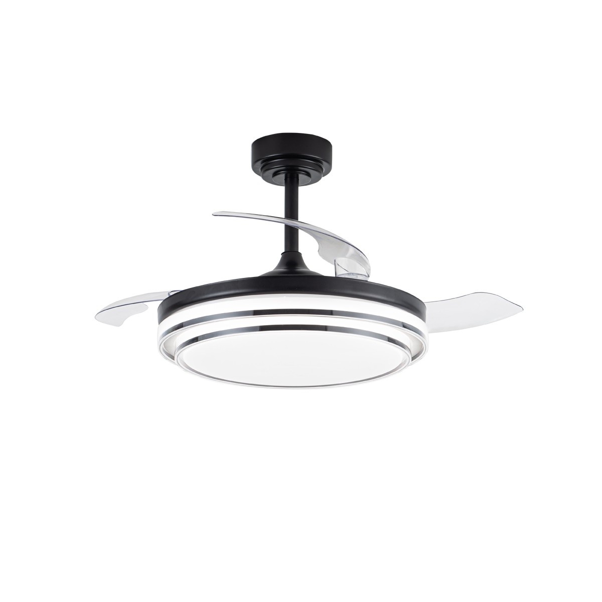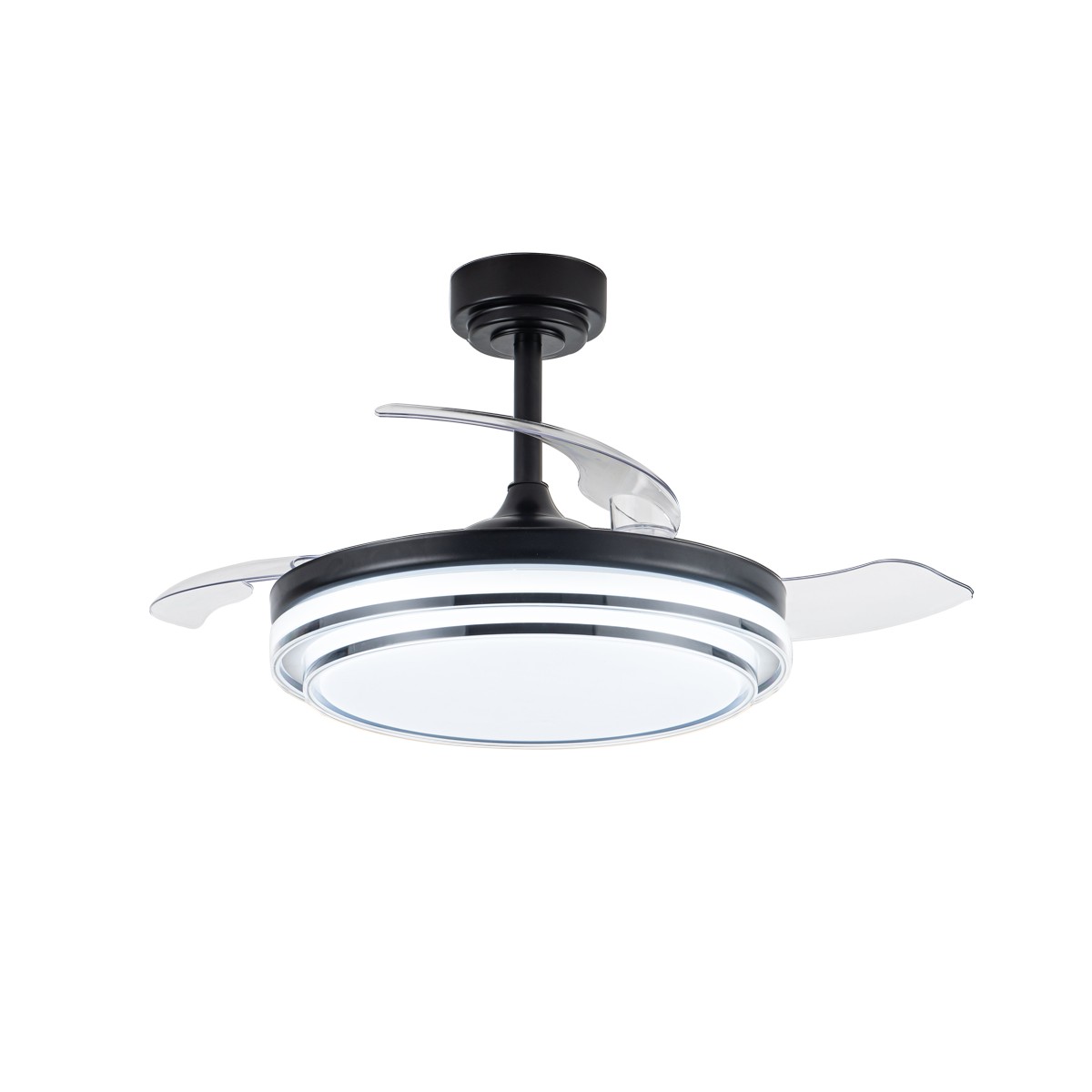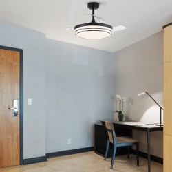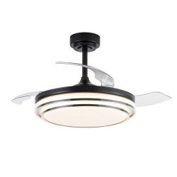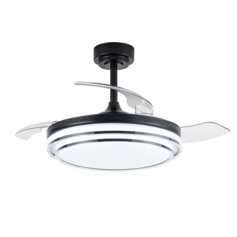 Ventilateur de plafond Lander avec pales repliables. Ventilateur ultra-silencieux doté de six vitesses de rotation, d'une fonction d'inversion et d'une minuterie. Il est doté de pales escamotables qui restent rétractées sur le moteur lorsque le ventilateur n'est pas en marche. La télécommande permet de régler la couleur et l'intensité de l'éclairage. Ventilateur de plafond noir avec pales transparentes en PC. Recommandé pour des pièces de 13 à 20 m3.