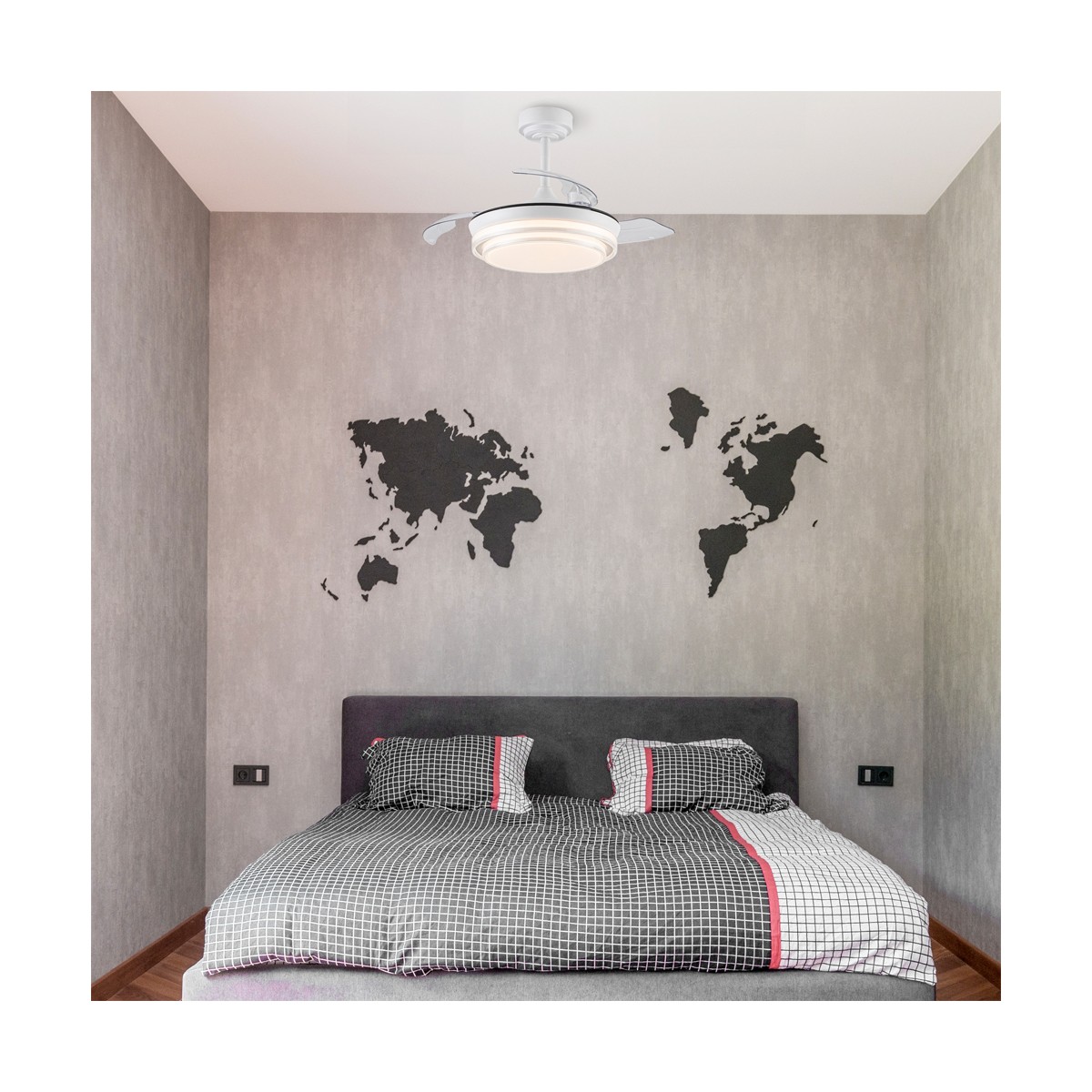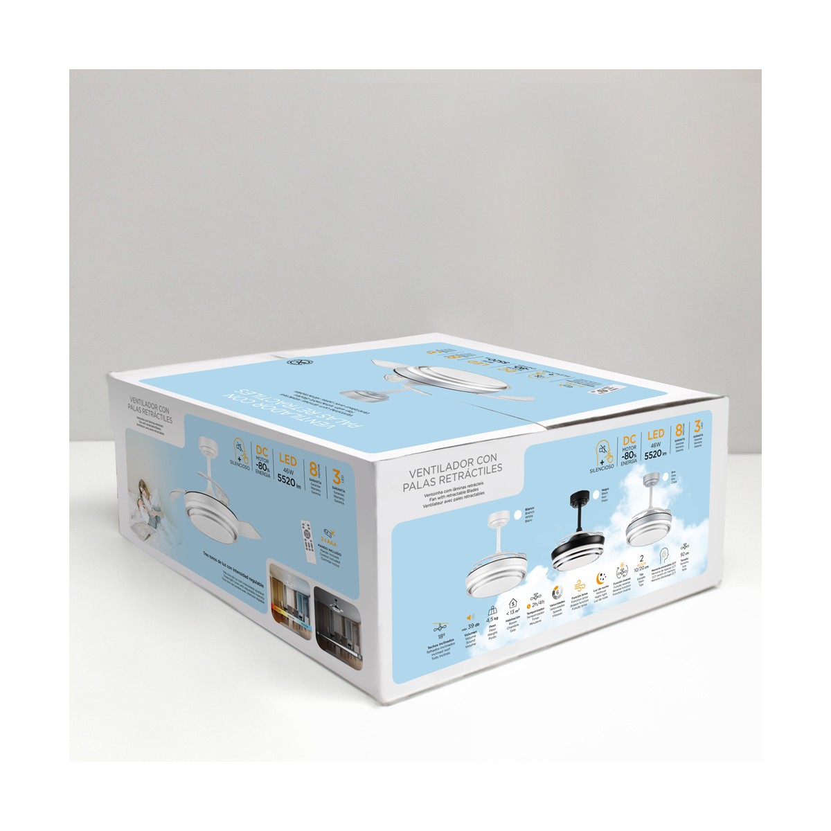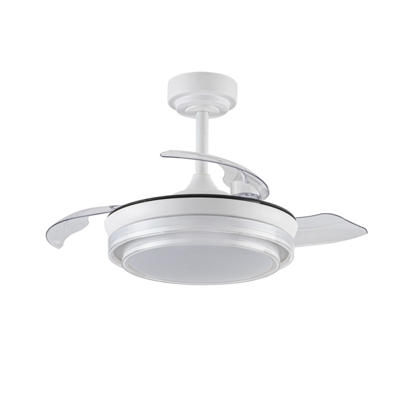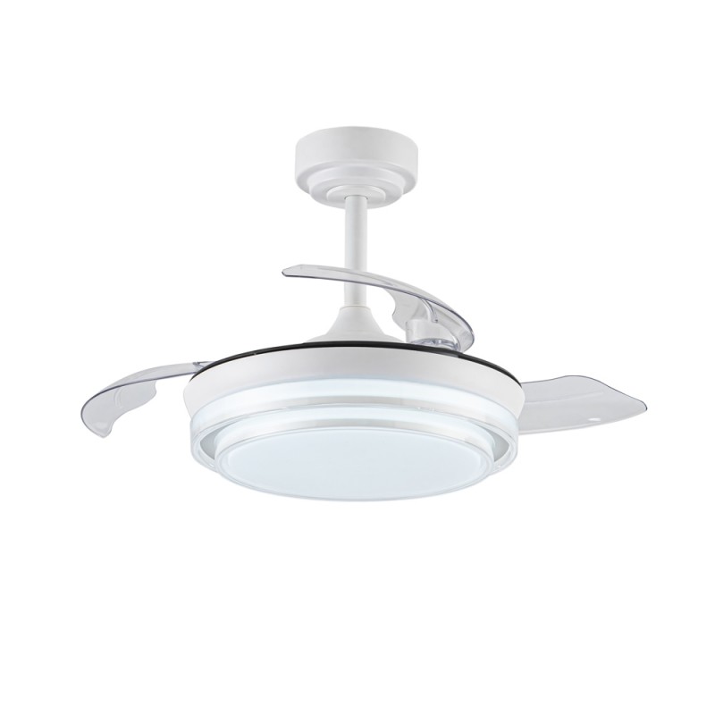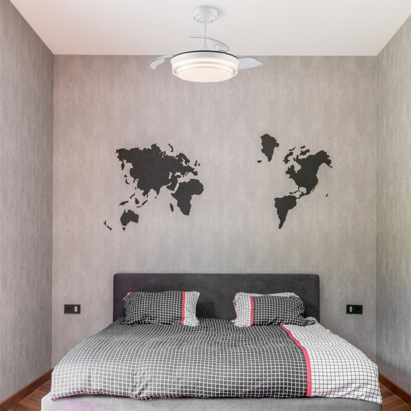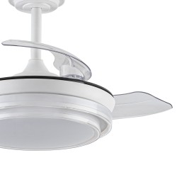 Ventilateur de plafond Lander avec pales repliables. Ventilateur ultra-silencieux doté de six vitesses de rotation, d'une fonction d'inversion et d'une minuterie. Il est doté de pales escamotables qui restent rétractées sur le moteur lorsque le ventilateur n'est pas en marche. La télécommande permet de régler la couleur et l'intensité de l'éclairage. Ventilateur de plafond blanc à pales rétractables recommandé pour les petites pièces de moins de 13 m3.