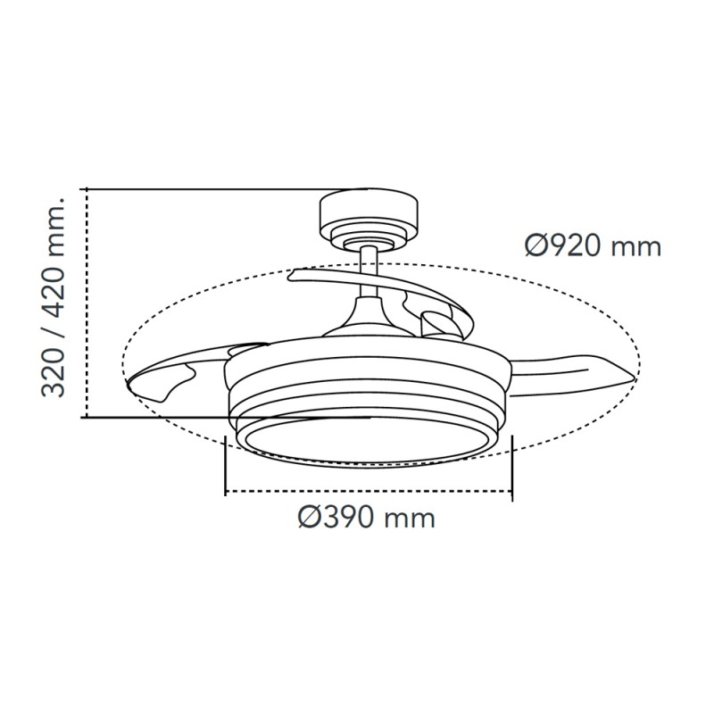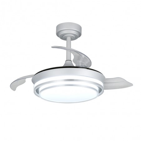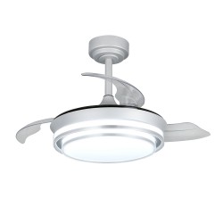 Ventilateur de plafond Lander avec pales repliables. Ventilateur ultra-silencieux avec six vitesses de rotation, fonction d'inversion et minuterie. Il est doté de pales escamotables qui restent rétractées sur le moteur lorsque le ventilateur n'est pas en marche. La télécommande permet de régler la couleur et l'intensité de l'éclairage. Ventilateur de plafond argenté à pales rétractables recommandé pour les petites pièces de moins de 13 m3.