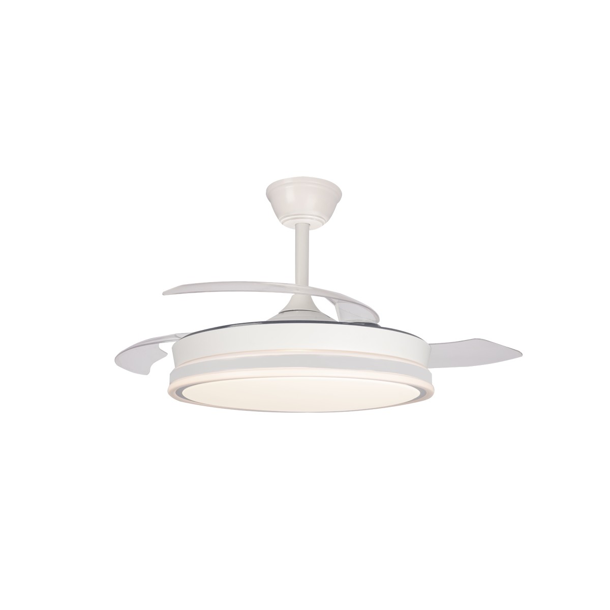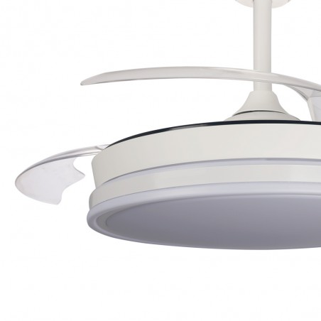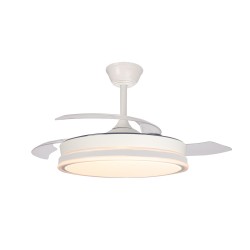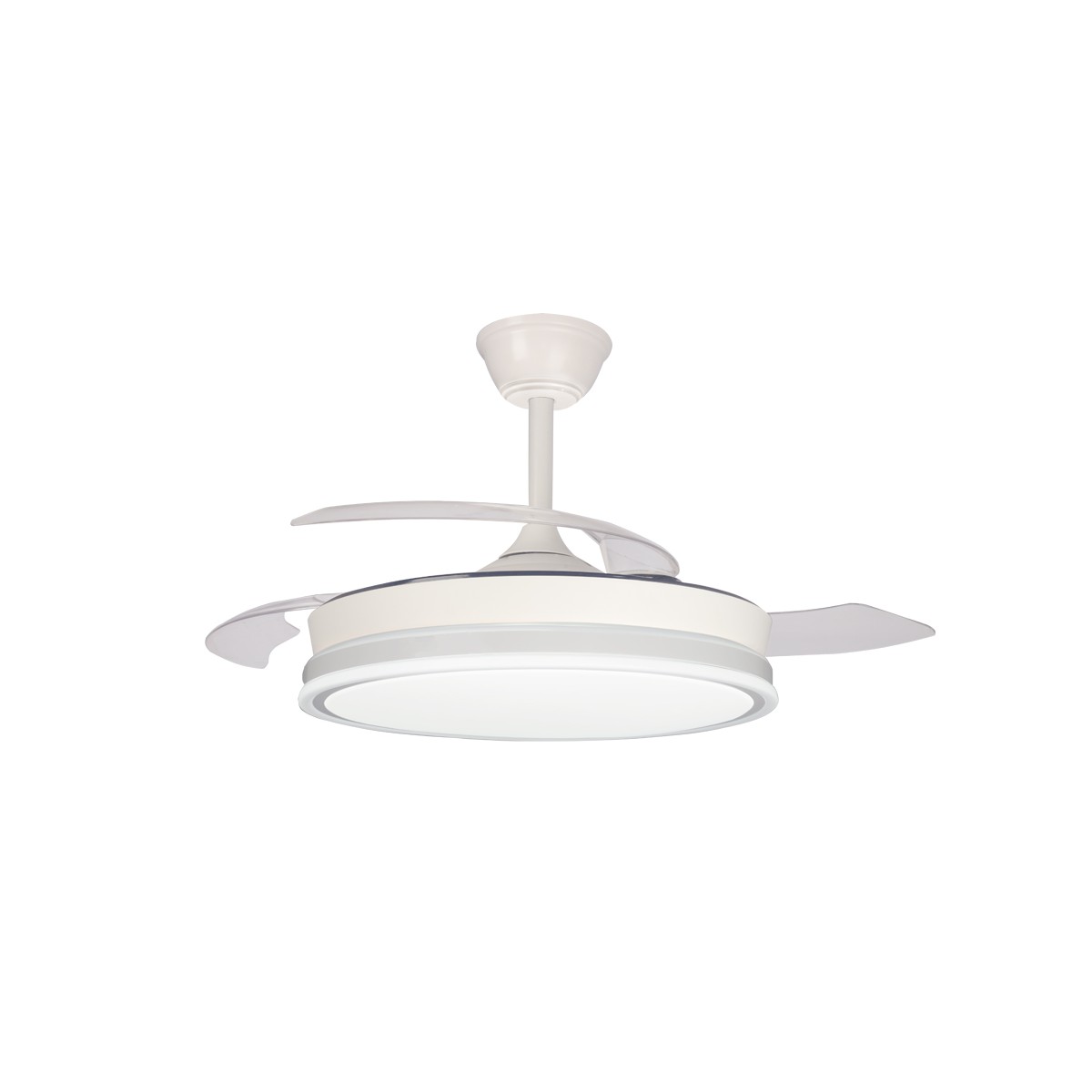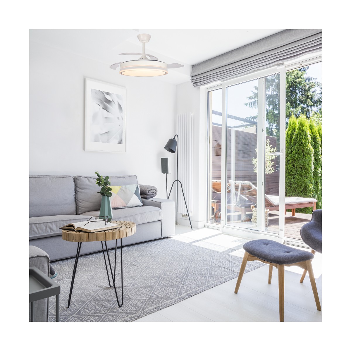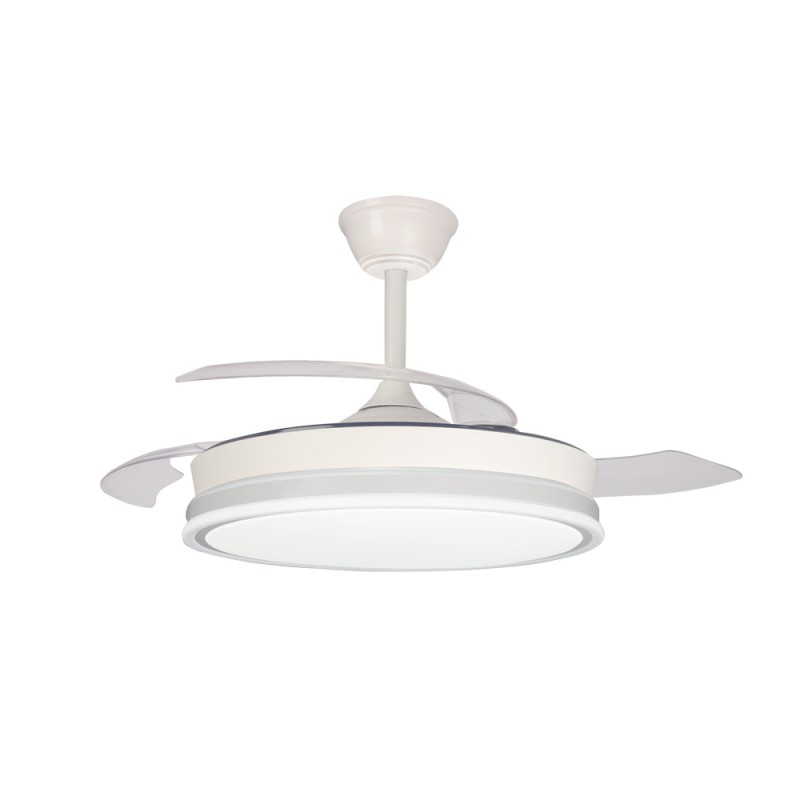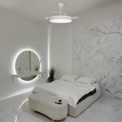 Ventilateur silencieux pour chambres à coucher. Ventilateur blanc à pales rétractables spécialement conçu pour les chambres et les salons. Son moteur à courant continu à six vitesses émet un bruit minimal lorsque le ventilateur fonctionne. Il est doté d'un éclairage LED à économie d'énergie et peut être facilement réglé à l'aide de la télécommande. Fonction d'inversion hiver-été, minuterie et mémoire des couleurs. Ventilateur silencieux avec pales rétractables.