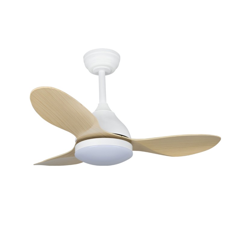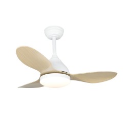 Ventilateur de plafond silencieux pour les petites pièces. Eclairage LED intégré réglable en intensité et en température de couleur. Avec moteur DC silencieux, fonctionne à 6 vitesses différentes et comprend une minuterie de 1-2-4h ainsi qu'une fonction été-hiver. Mémoire d'allumage avec la dernière configuration d'éclairage. Télécommande incluse pour contrôler le ventilateur et l'éclairage. Design nordique avec structure blanche et trois pales en ABS couleur bois clair.