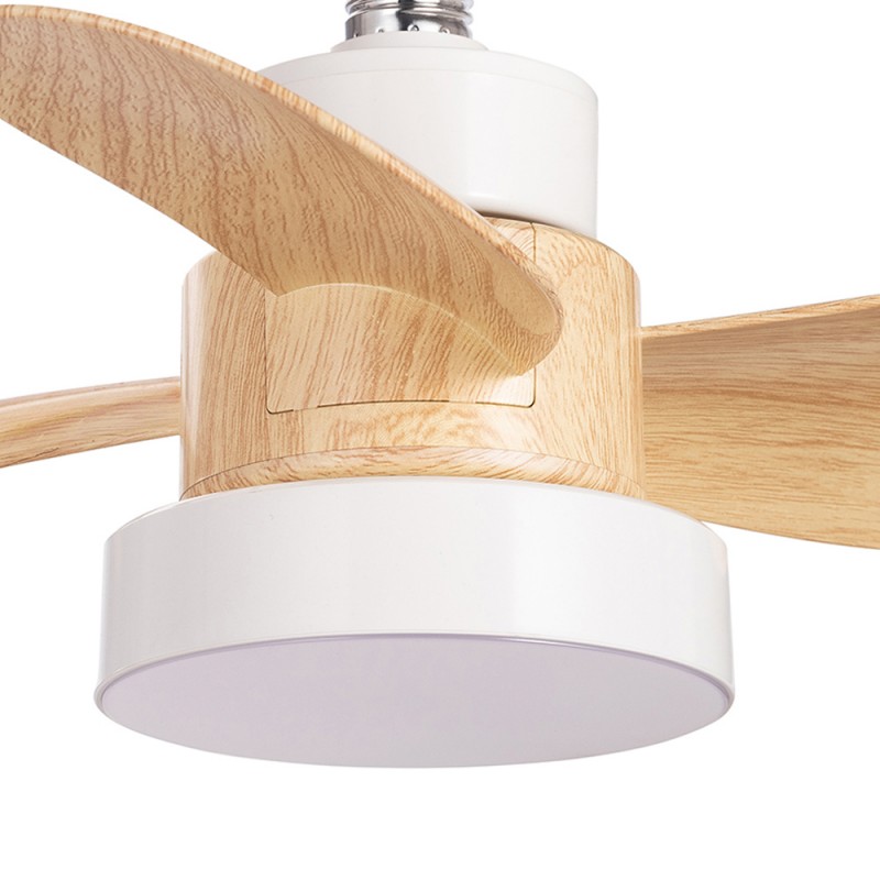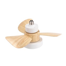 Ventilateur culot E27 Bayad. Ventilateur compact à trois vitesses conçu pour s'adapter à une douille de lampe ou à un culot E27. Très pratique pour assurer un flux d'air agréable dans n'importe quel endroit. De plus, il intègre un éclairage LED de 15W réglable en intensité et en température de couleur. Ventilateur blanc avec pales en ABS effet bois de hêtre.