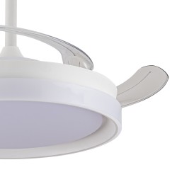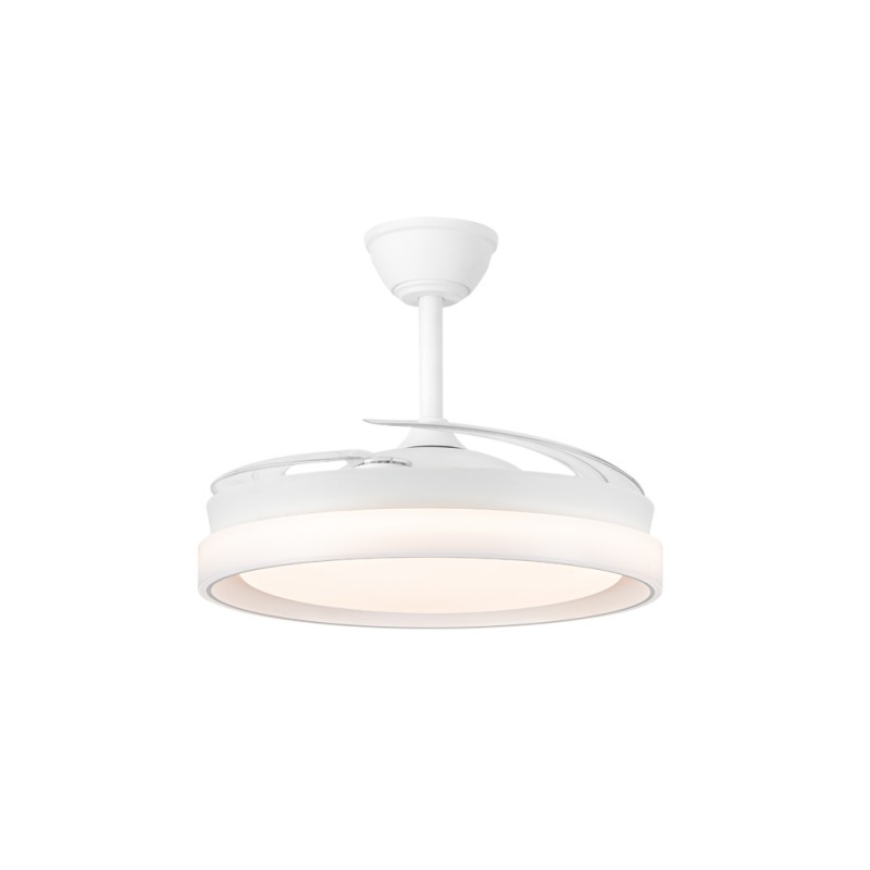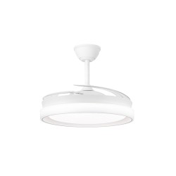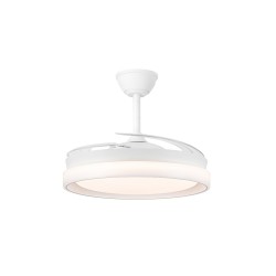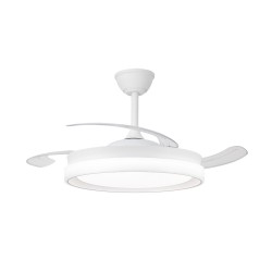 Ventilateur silencieux pour chambres à coucher. Ventilateur blanc à pales rétractables spécialement conçu pour les chambres et les salons. Son moteur à courant continu à six vitesses émet un bruit minimal lorsque le ventilateur fonctionne. Il est doté d'un éclairage LED à économie d'énergie et peut être facilement réglé à l'aide de la télécommande. Fonction d'inversion hiver-été, minuterie et mémoire des couleurs. Ventilateur silencieux avec pales rétractables.
