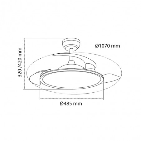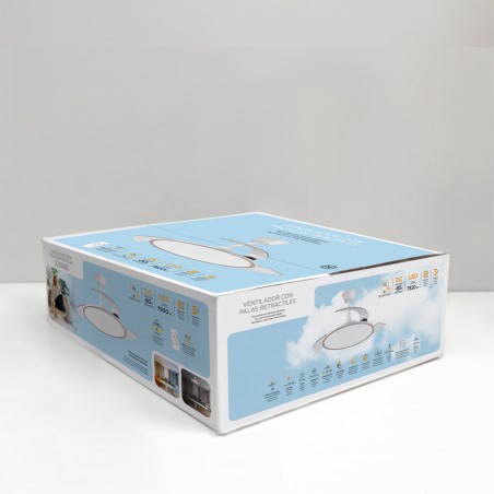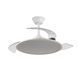 Ventilateur de plafond Trident LED avec pales rétractables. Ventilateur blanc moderne au design minimaliste et pratique, conçu à la fois pour ventiler et éclairer la pièce. Il est doté d'un éclairage LED intégré avec intensité lumineuse réglable et trois températures de couleur (3000-4000-6000K). De plus, la télécommande permet de sélectionner la fonction brise, un mode veilleuse ou de régler le ventilateur pour qu'il s'éteigne au bout de 2 à 4 heures. Avec un diamètre de 107 cm lorsque les pales sont déployées, il est idéal pour les pièces de 13 à 20 mètres carrés. Moteur à courant continu ultra-silencieux avec six vitesses de rotation et fonction d'inversion hiver-été.