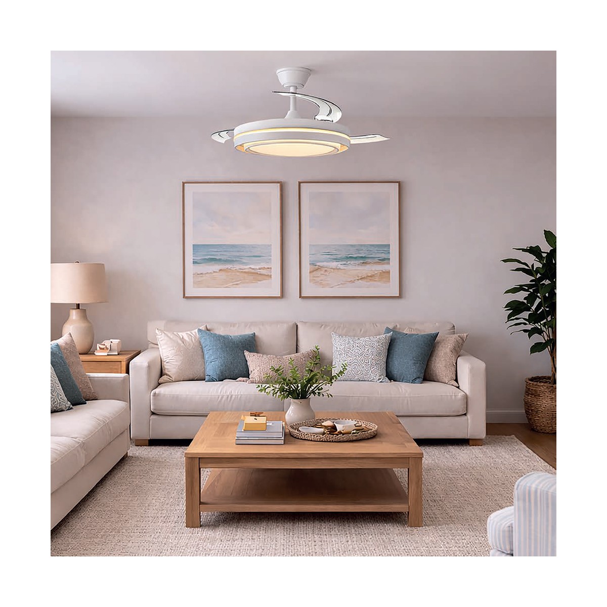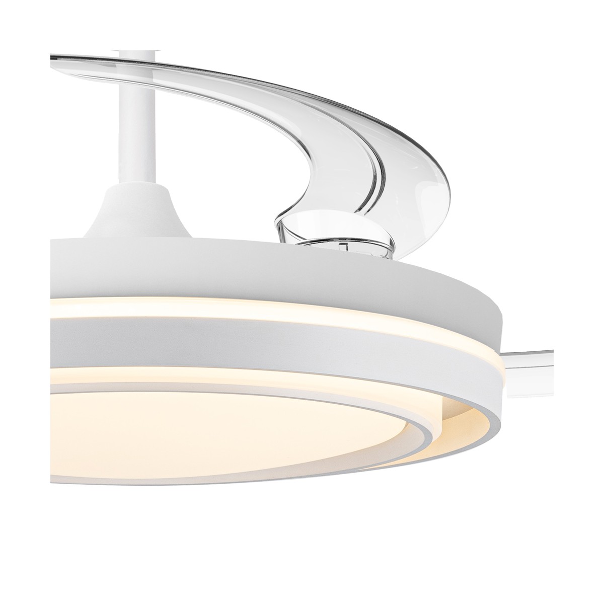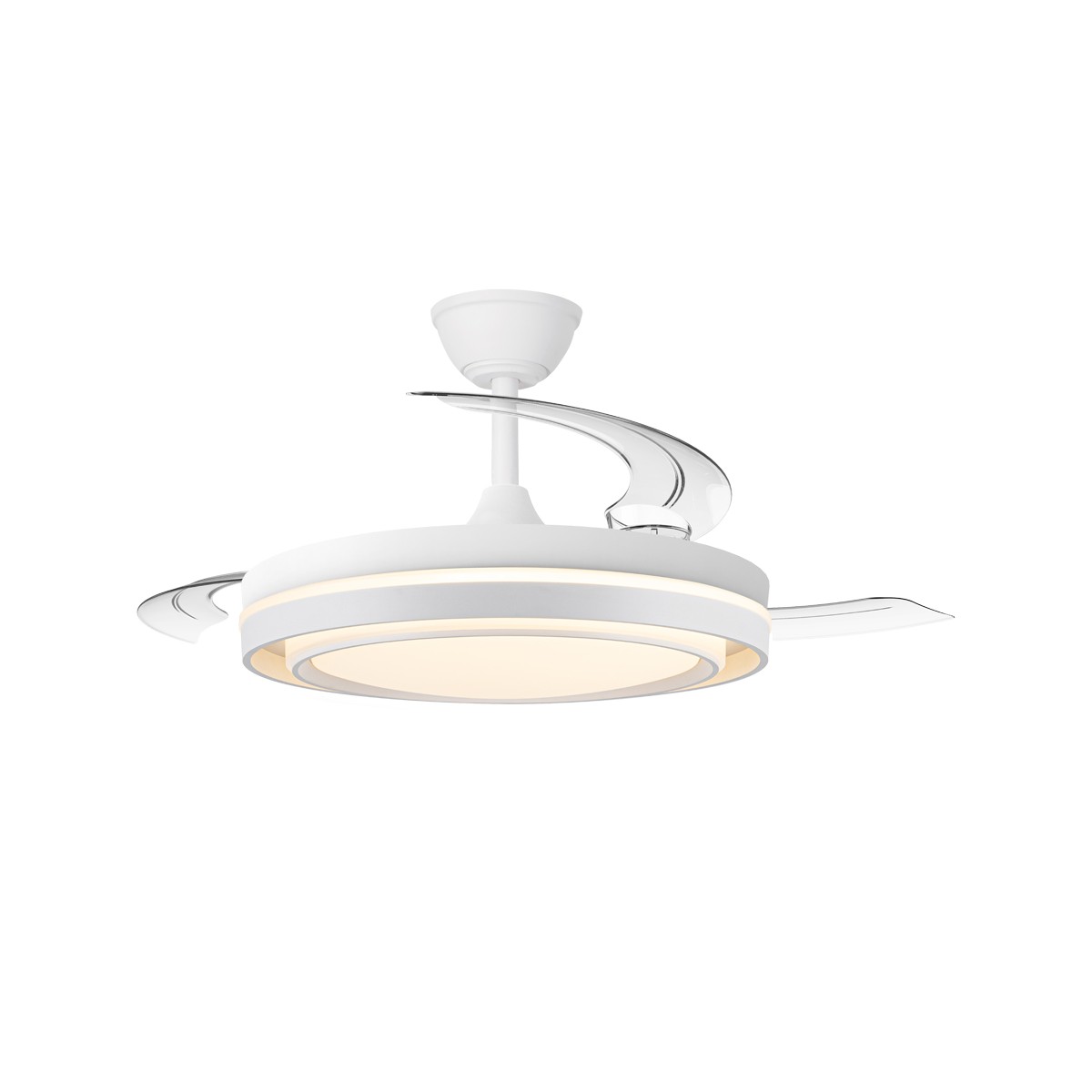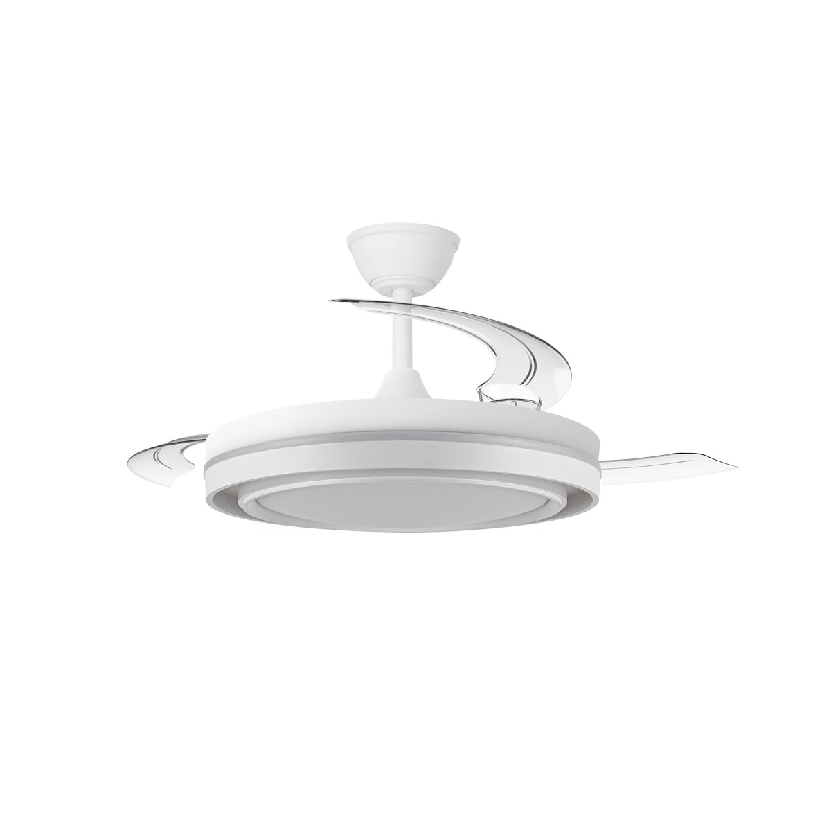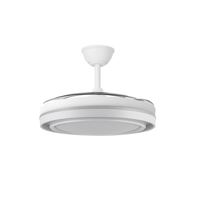 Ventilateur silencieux pour chambres à coucher Nassot Blanc. Ventilateur blanc avec pales rétractables spécialement conçu pour les chambres à coucher et les salons. Son moteur CC à six vitesses émet un minimum de bruit lorsque le ventilateur est en marche. Il est équipé d'un éclairage LED à faible consommation d'énergie et peut être facilement réglé à l'aide de la télécommande. Fonction inverse hiver-été, minuterie et mémoire de couleur. Ventilateur silencieux avec pales rétractables.