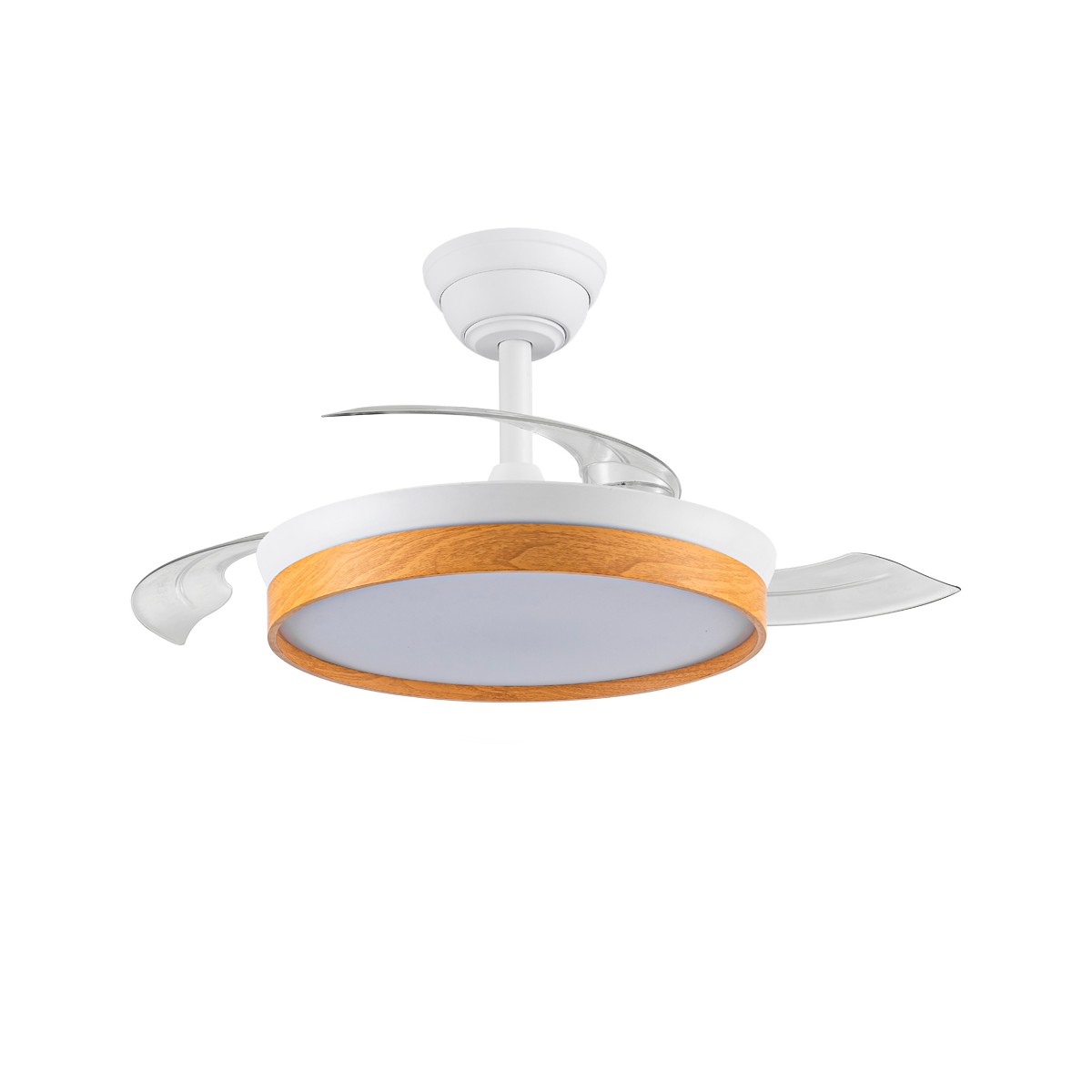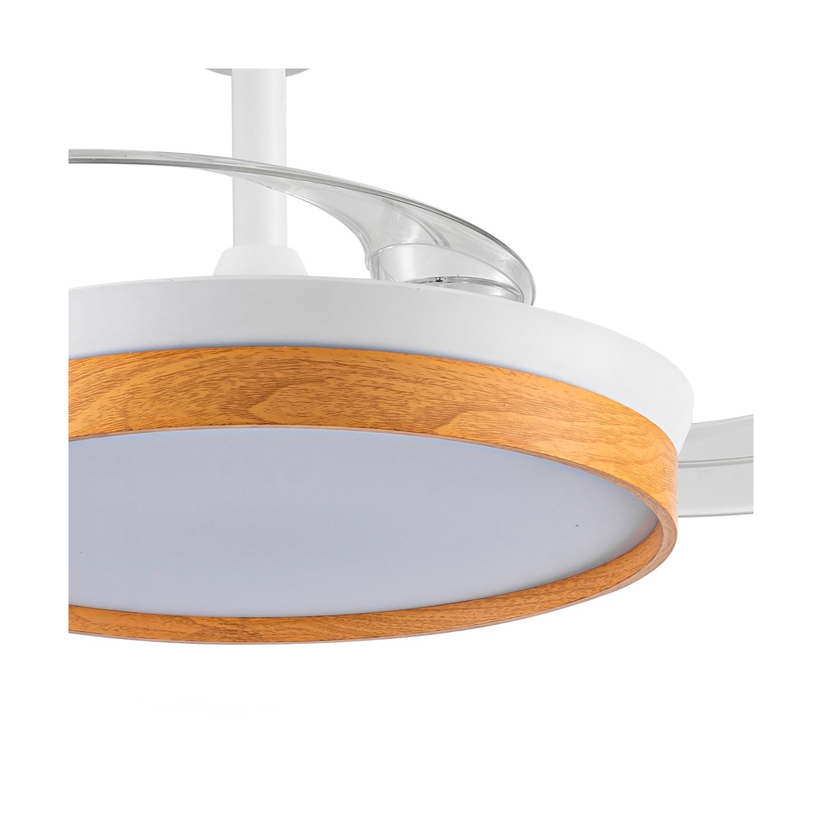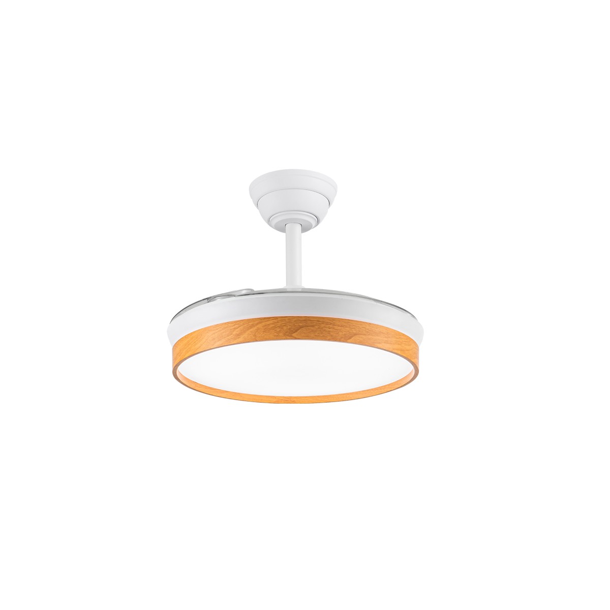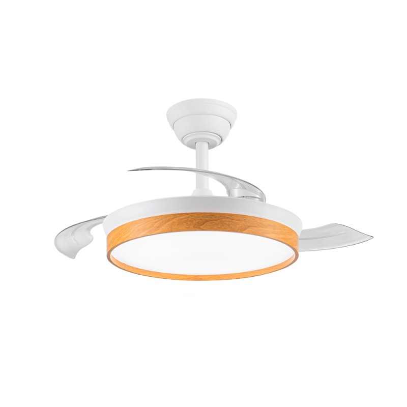 Ventilateur silencieux Paneco Cendre pour chambres à coucher. Ventilateur blanc et effet bois cendré à pales rétractables spécialement conçu pour les chambres et les salons. Son moteur à courant continu à six vitesses émet un bruit minimal lorsque le ventilateur fonctionne. Il est doté d'un éclairage LED à économie d'énergie et peut être facilement réglé à l'aide de la télécommande. Fonction d'inversion hiver-été, minuterie et mémoire des couleurs. Ventilateur silencieux avec pales rétractables.