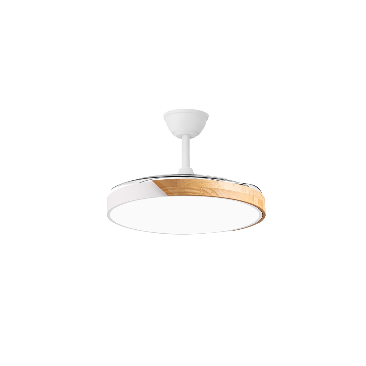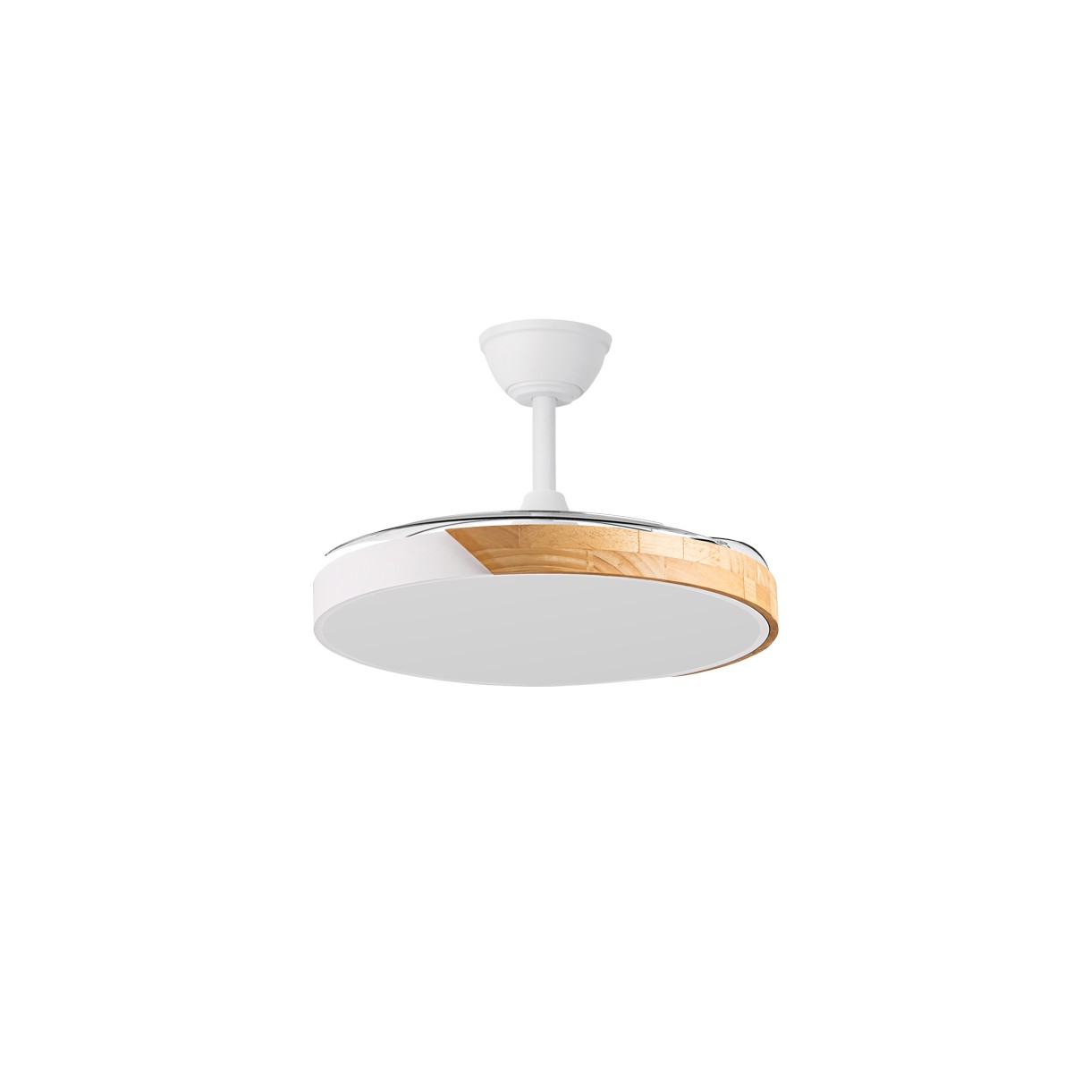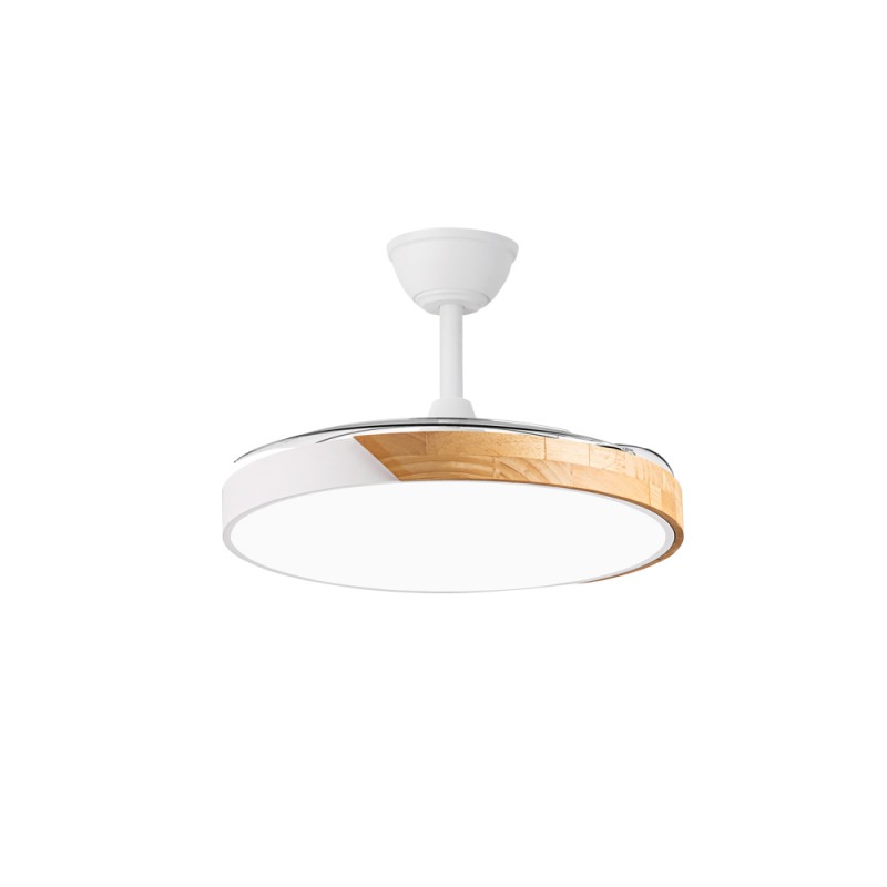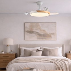 Ventilateur LED Taoro pour salons. Ventilateur blanc avec décor effet bois et pales rétractables, spécialement conçu pour les chambres et les salons. Son moteur DC à six vitesses émet un minimum de bruit lorsque le ventilateur est en marche. Il est équipé d'un éclairage LED à faible consommation d'énergie et peut être facilement réglé à l'aide de la télécommande. Fonction inverse hiver-été, minuterie et mémoire de couleur. Ventilateur silencieux avec pales rétractables.