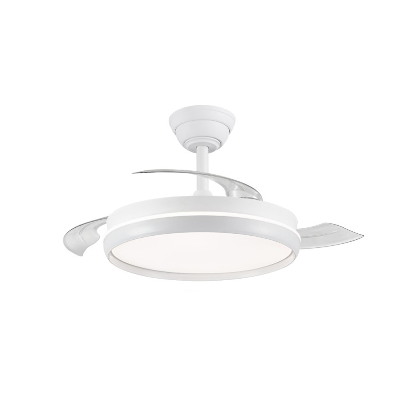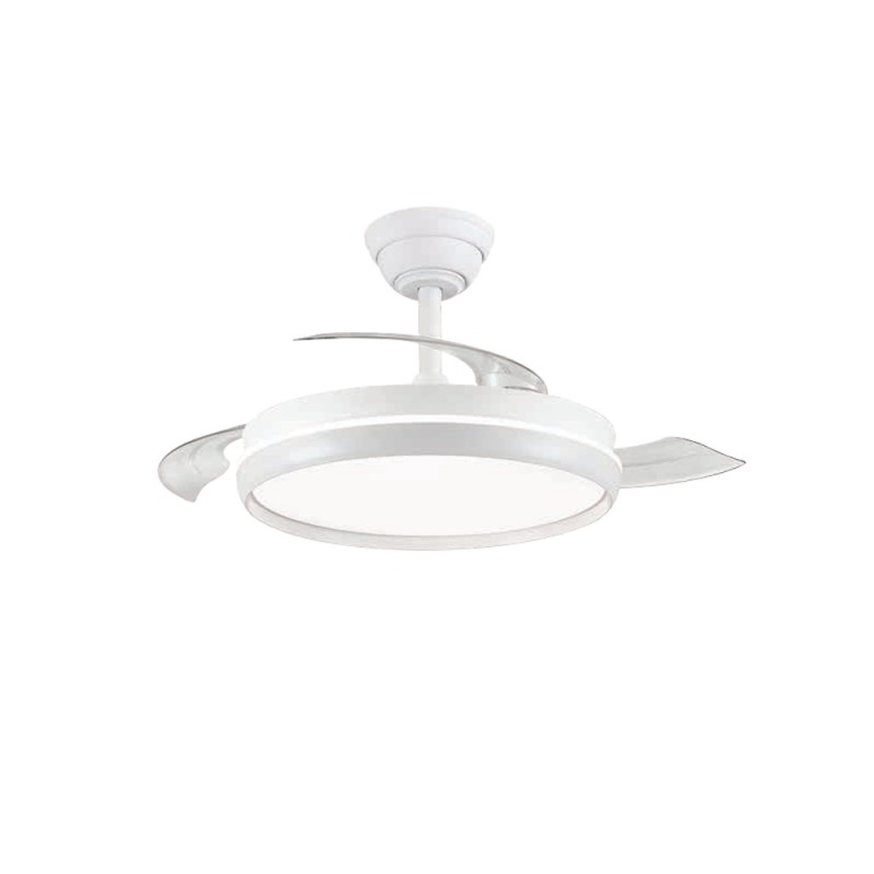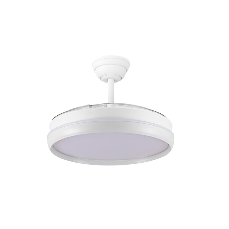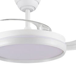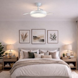 Ventilateur silencieux pour chambres à coucher. Ventilateur blanc à pales rétractables spécialement conçu pour les chambres et les salons. Son moteur à courant continu à six vitesses émet un bruit minimal lorsque le ventilateur fonctionne. Il est doté d'un éclairage LED à économie d'énergie et peut être facilement réglé à l'aide de la télécommande. Fonction d'inversion hiver-été, minuterie et mémoire des couleurs. Ventilateur silencieux avec pales rétractables.