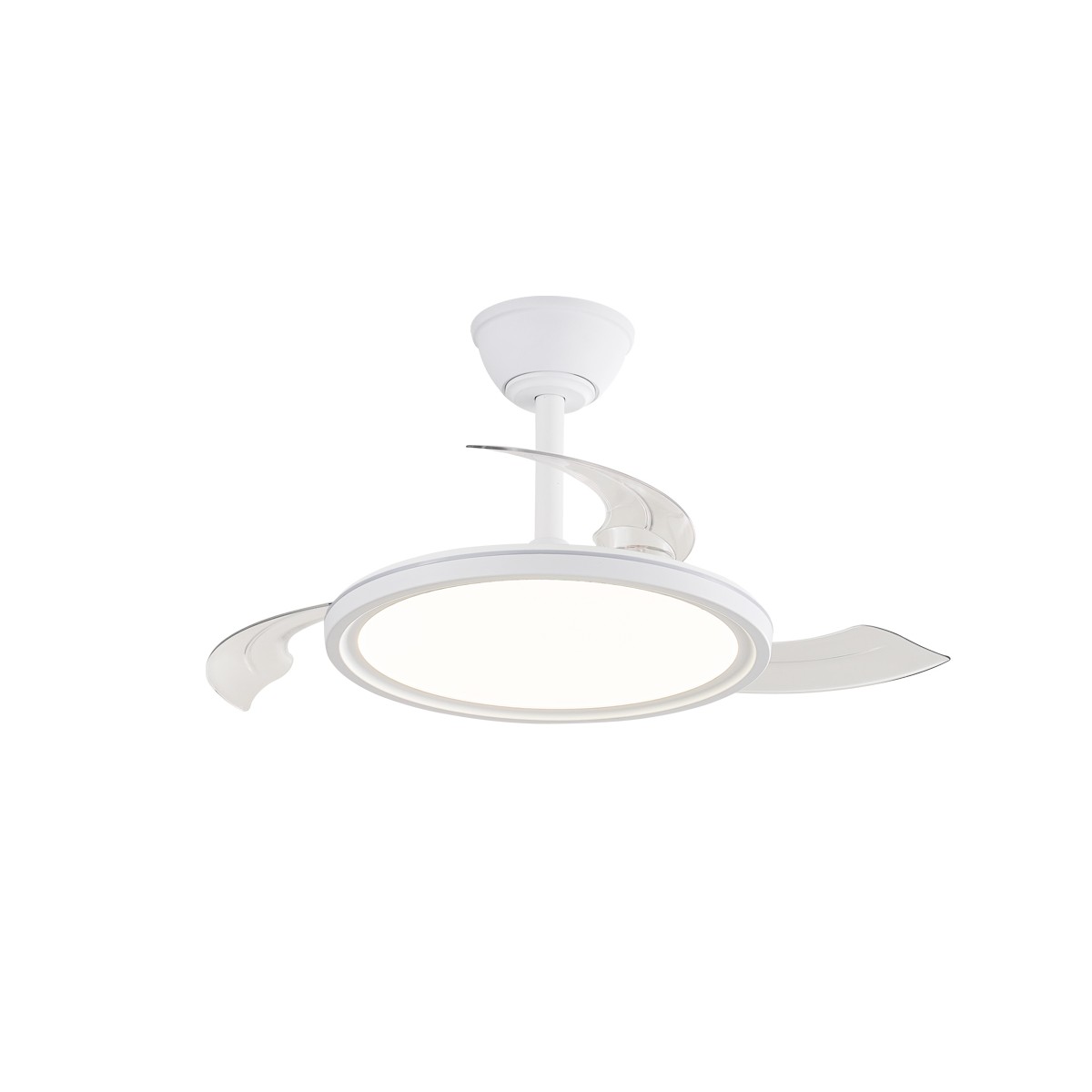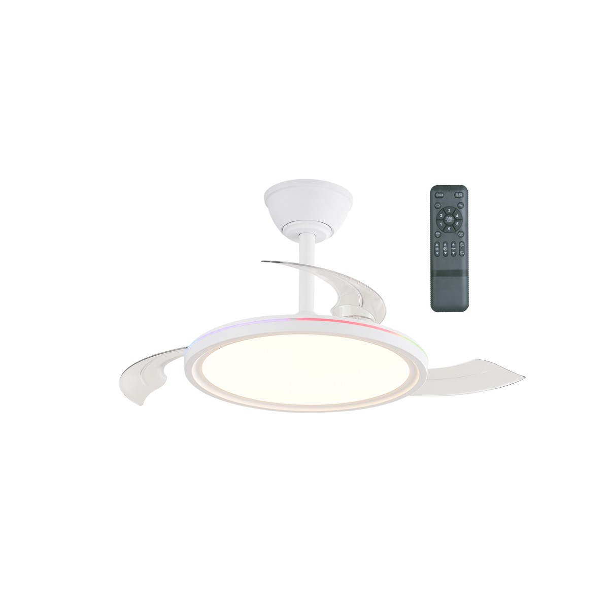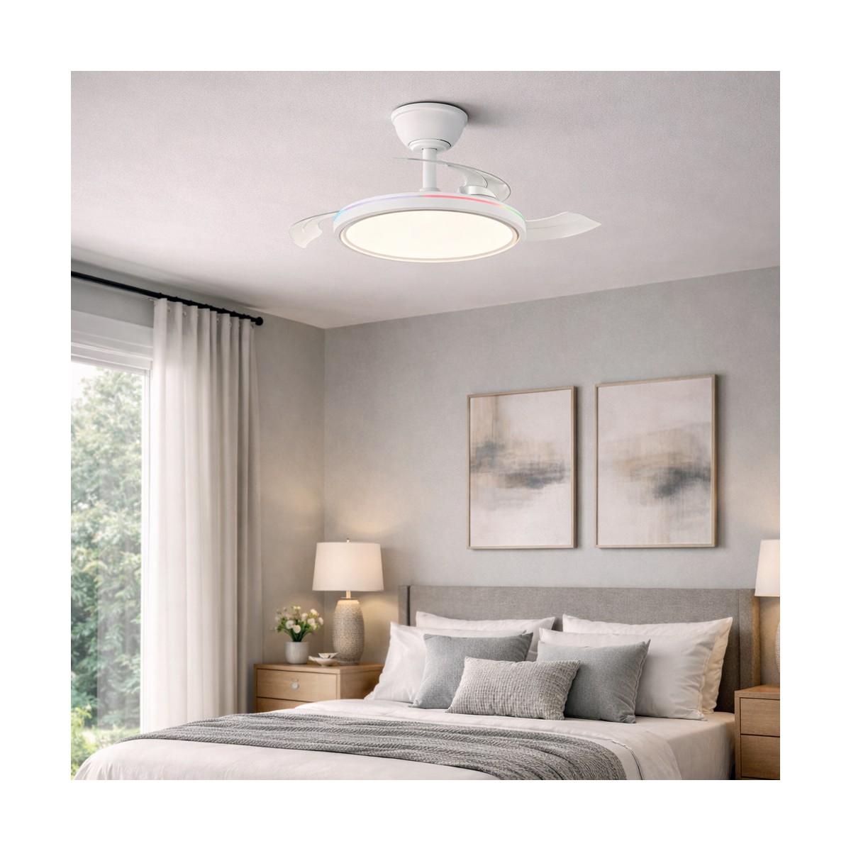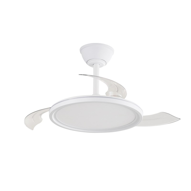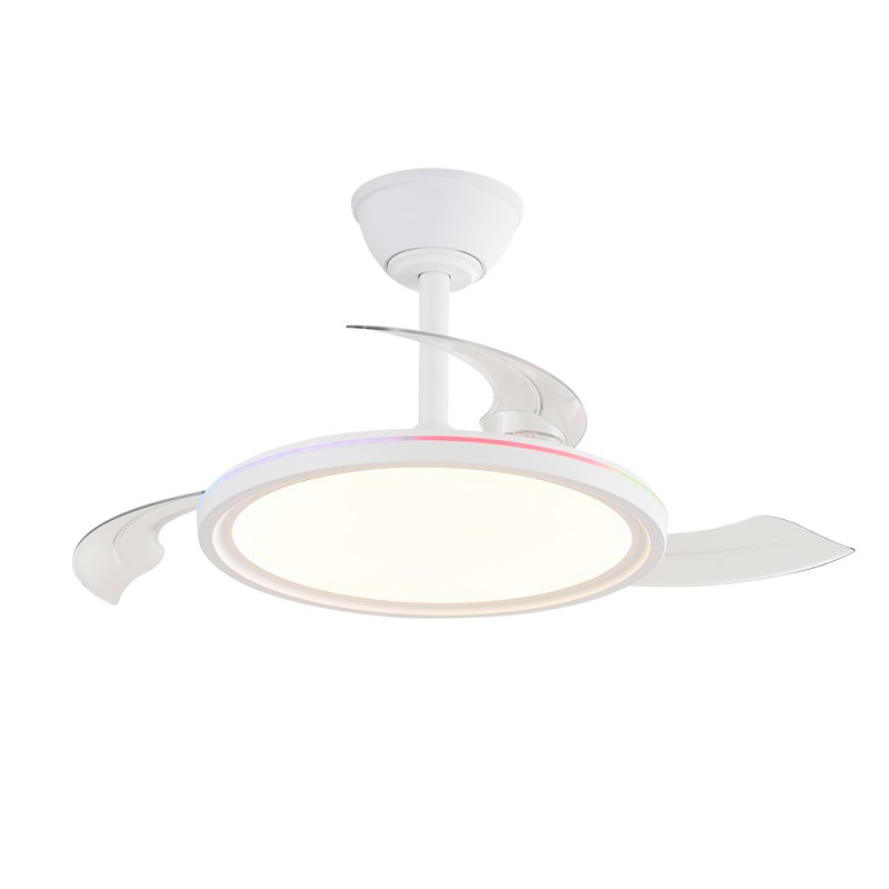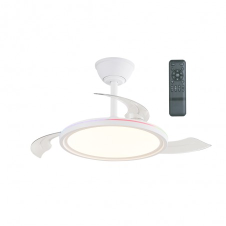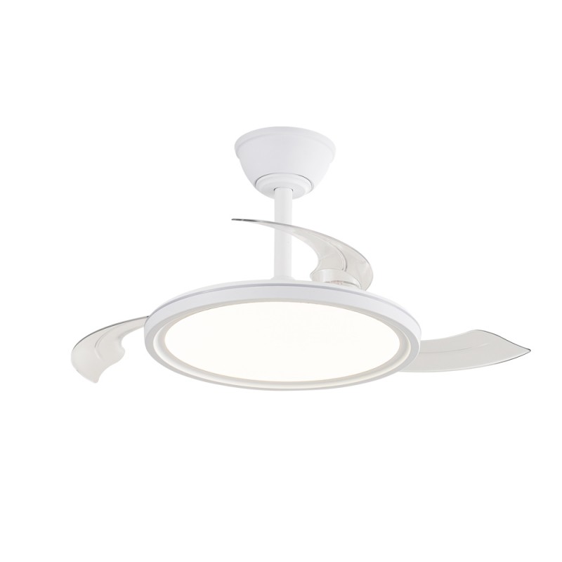 Ventilateur silencieux pour chambres à coucher. Ventilateur blanc à pales rétractables spécialement conçu pour les chambres et les salons. Son moteur à courant continu à six vitesses émet un bruit minimal lorsque le ventilateur fonctionne. Il est doté d'un éclairage LED à économie d'énergie et peut être facilement réglé à l'aide de la télécommande. Fonction d'inversion hiver-été, minuterie et mémoire des couleurs. Ventilateur silencieux avec pales rétractables.