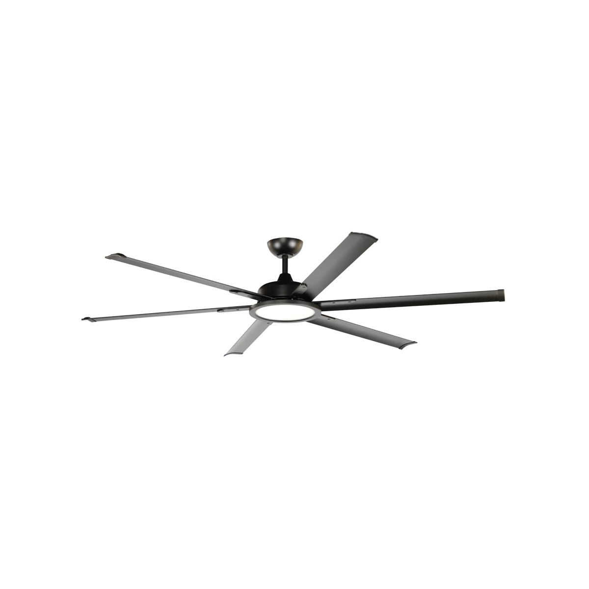 Ventilateur de plafond Avon de grande taille. Ventilateur de plafond à six pales d'un diamètre de 180 centimètres. Conçu pour être installé dans les locaux industriels et les grands espaces intérieurs. Moteur en acier, pales en aluminium et diffuseur en PMMA. Télécommande pour contrôler le ventilateur et l'éclairage. Moteur à courant continu.