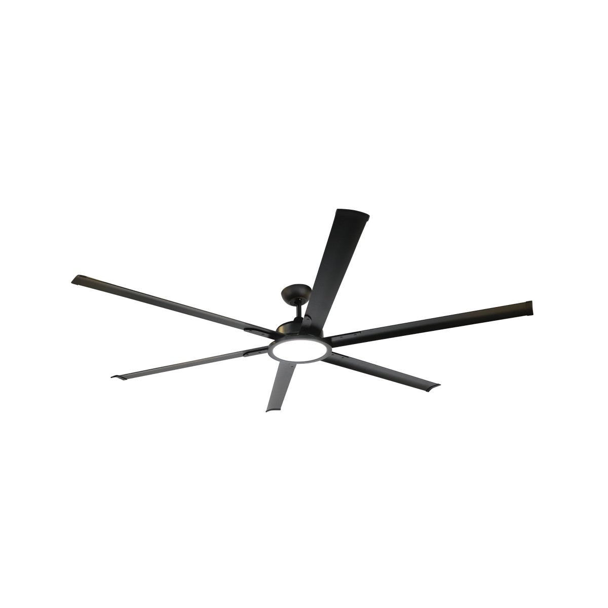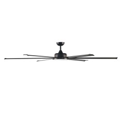 Ventilateur de plafond Avon de grande taille. Ventilateur de plafond à six pales d'un diamètre de 250 centimètres. Conçu pour être installé dans les locaux industriels et les grands espaces intérieurs. Moteur en acier, pales en aluminium et diffuseur en PMMA. Télécommande pour contrôler le ventilateur et l'éclairage. Moteur à courant continu.