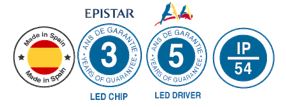 Round technical LED Downlight for ceiling, where quality of products is made in Spain. Thanks to its IP54 it is recommended for damp places. Driver included on all products.