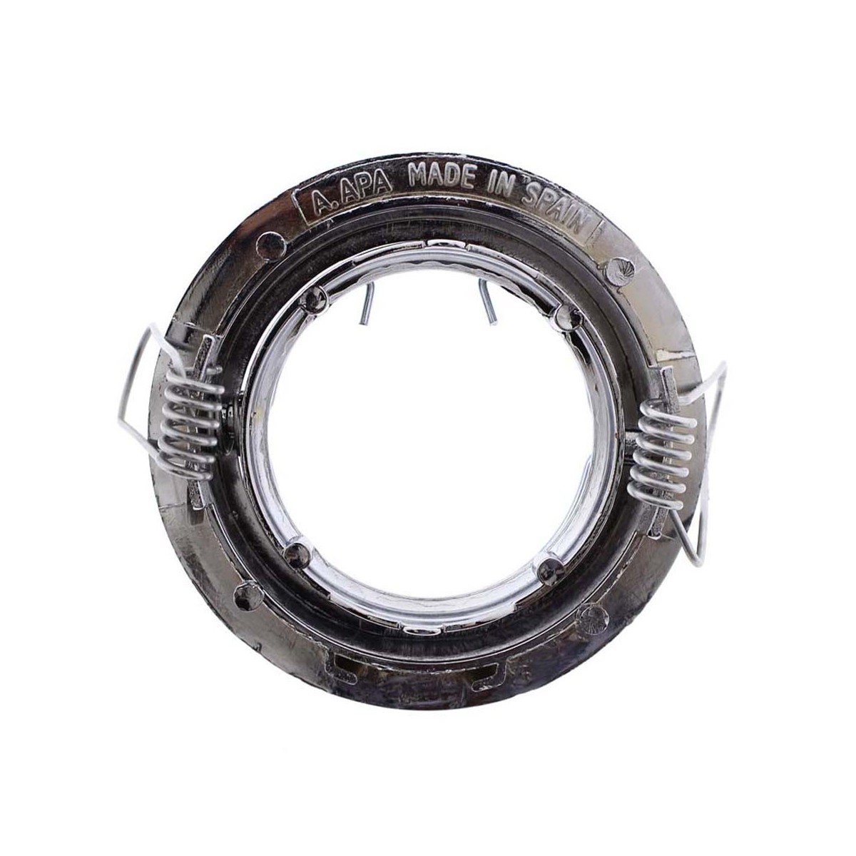 Fixed round recessed spotlight in chrome finish for ceiling installation. The recessed spotlight has a standard circular shape that seeks to achieve easy integration into different types of ceilings. With a fixed light point, this type of recessed light is designed to install several recessed lights in the ceiling along a corridor to illuminate a passageway. The bulb is easily replaceable from the front of the recessed downlight, so it is not necessary to remove it from the ceiling to do so. Fixed recessed ceiling light made from high quality zamak with a chrome plating. Available in other finishes, with or without lamp holder. Compatible with a LED module.