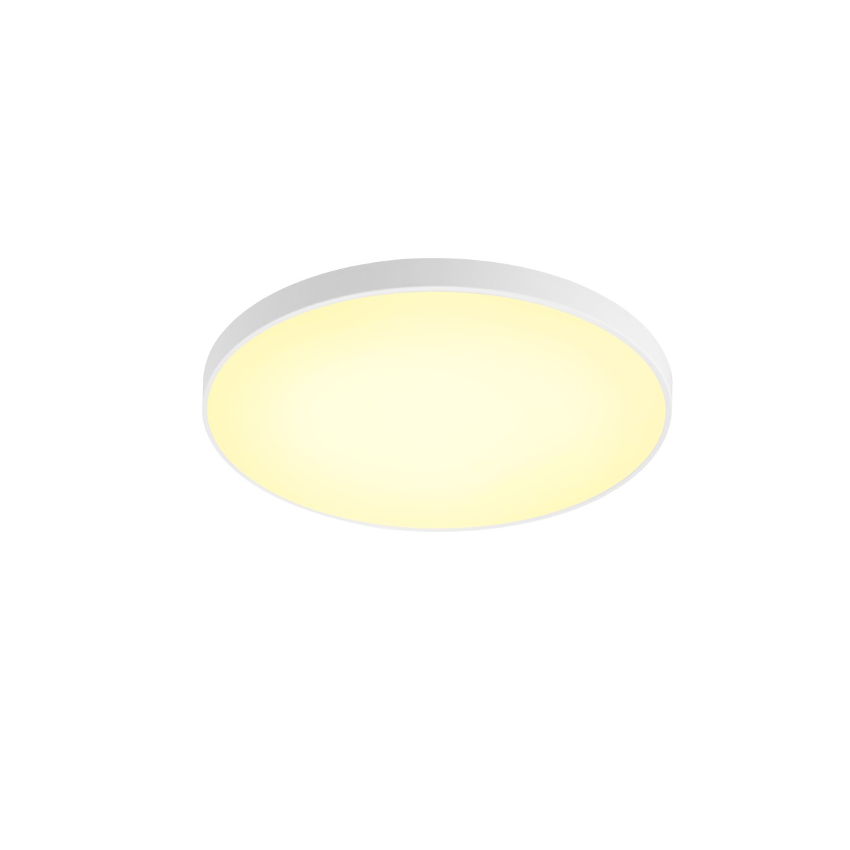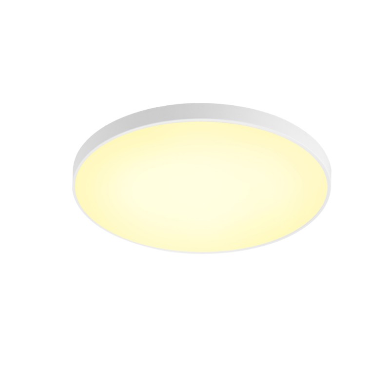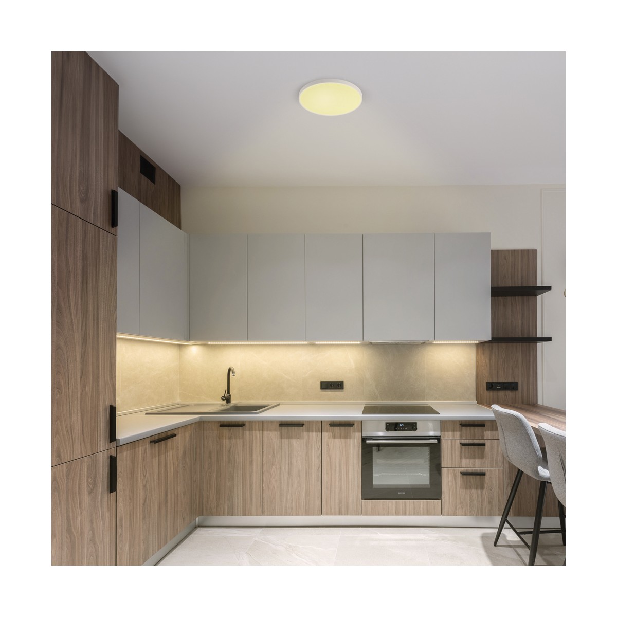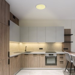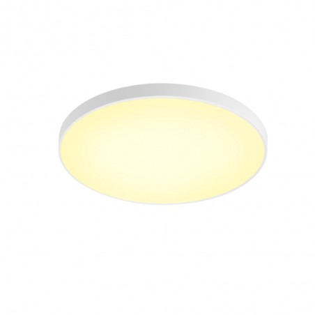 Surface-mounted downlight suitable for bathrooms. Circular downlight with LED technology designed to be installed in the ceiling of kitchens and bathrooms as lighting. Easy installation, directly on the ceiling. It has integrated LED light in a warm white hue (3000K) and is very practical as the main lighting in a bathroom or kitchen. Circular design with a diameter of 47 centimetres. IP44 rating.