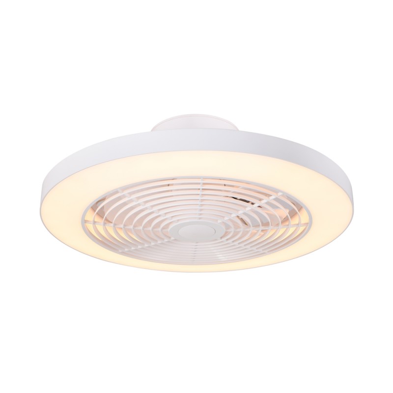 LED RGB fan Moli for bedrooms and rooms. Give an original touch to the lighting and ventilation of your room with this circular ceiling fan. It is white in colour and has integrated blades inside. In this way, the fan brings a concentrated airflow directly downwards. In addition to the main lighting projected from the bottom of the fan, it has a coloured RGB light projected towards the ceiling. Remote control included to control all fan functions. Five rotation speeds and winter-summer reverse function.