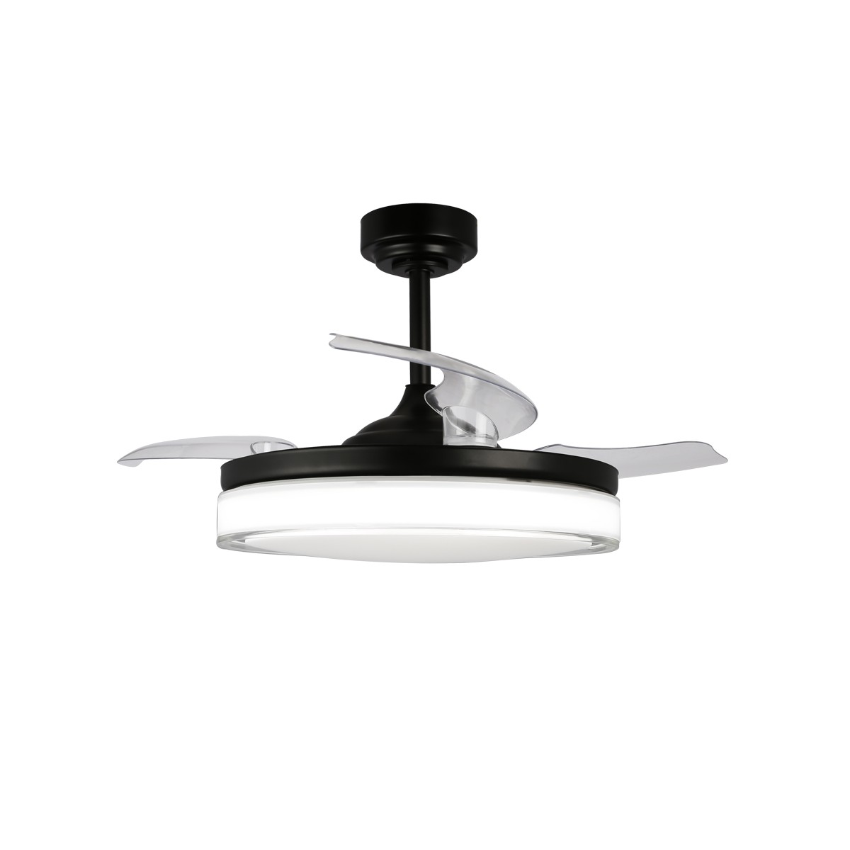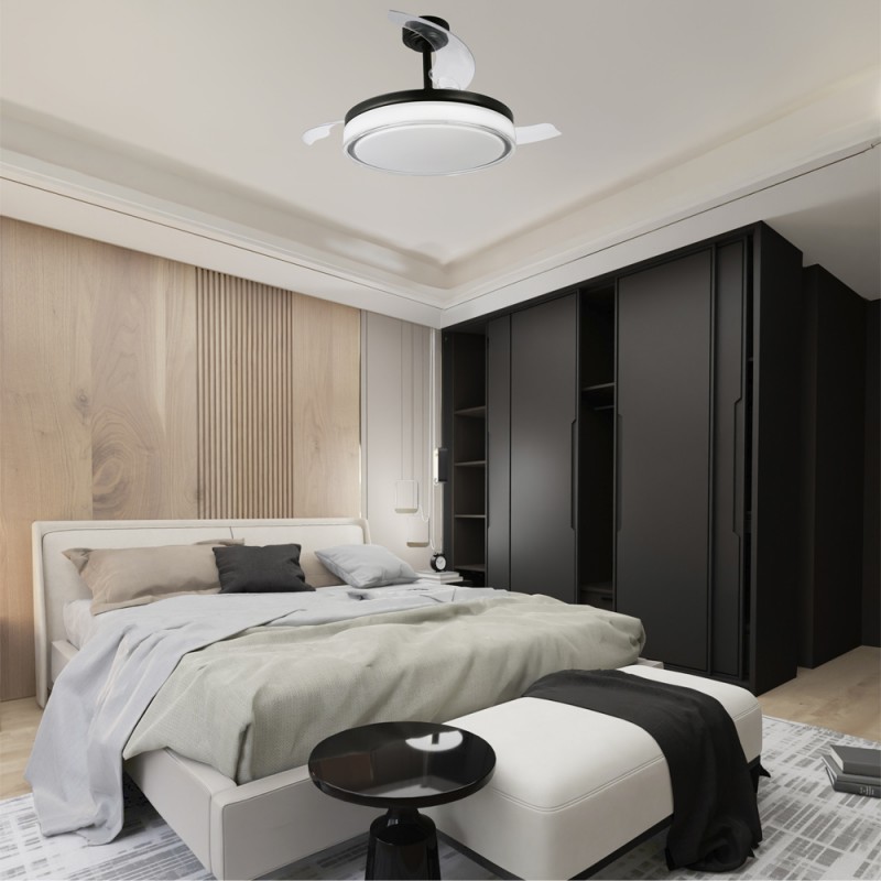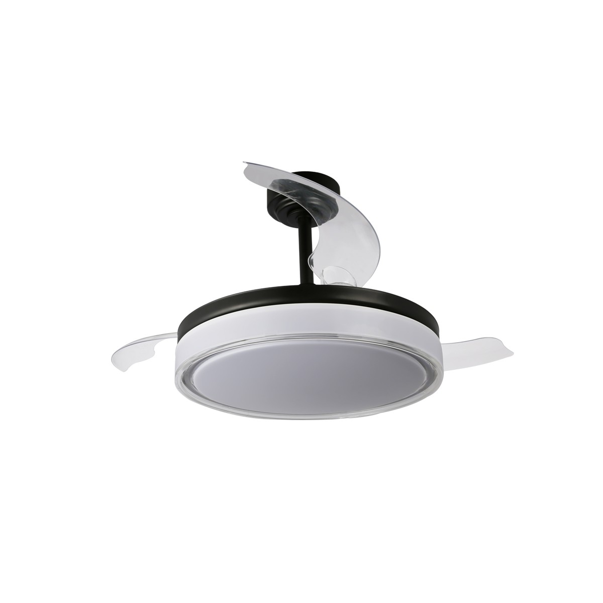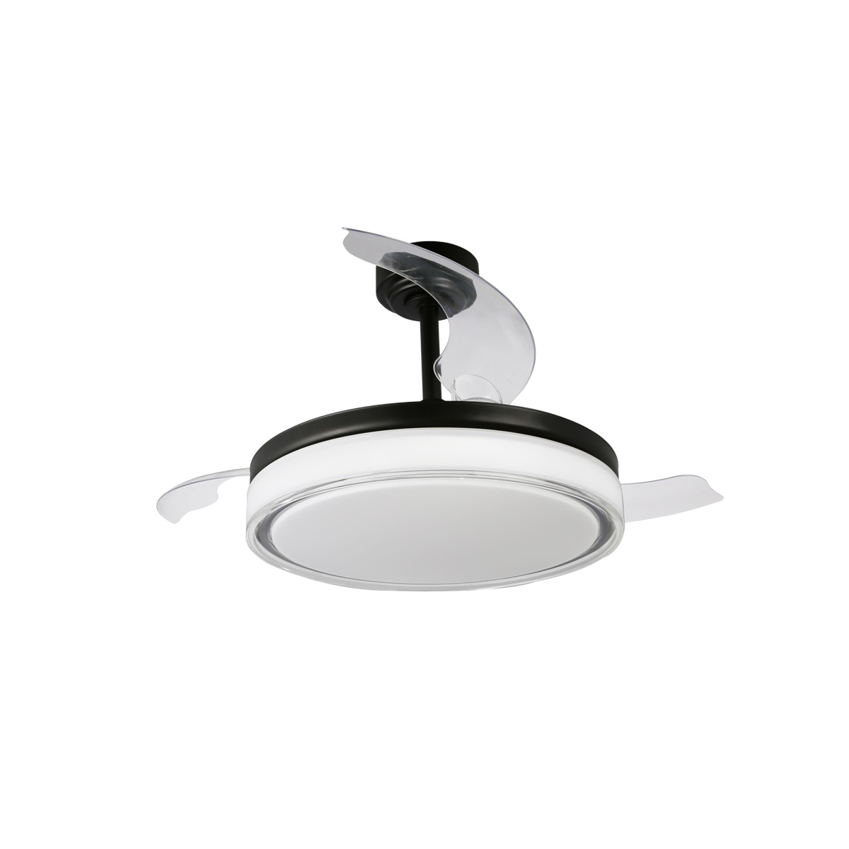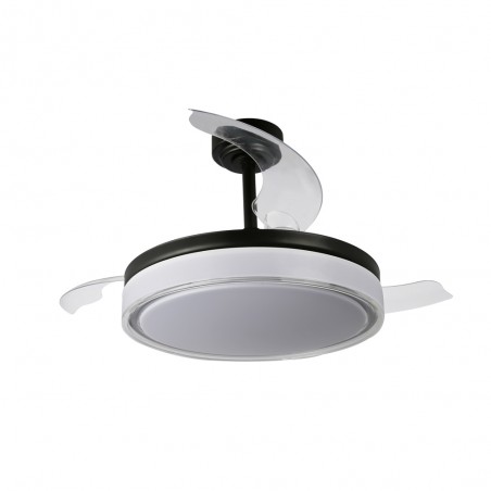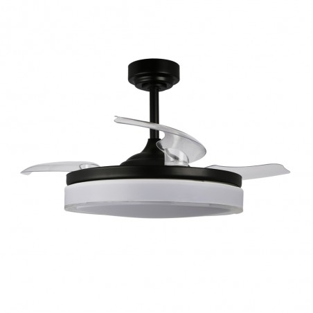 Aneto ceiling fan with retractable blades. Bring ample airflow into your bedroom or living room with this ultra-quiet fan with six rotation speeds. The fan has an integrated 72W LED light which allows to solve the main lighting of the room. The fan blades are retractable, allowing the fan to be used as a ceiling light when not in use. Includes remote control to control both the lighting and the rotation speed and functions of the fan. Three colour temperatures, power-on memory, reverse rotation function and timer. Black ceiling fan with transparent blades.